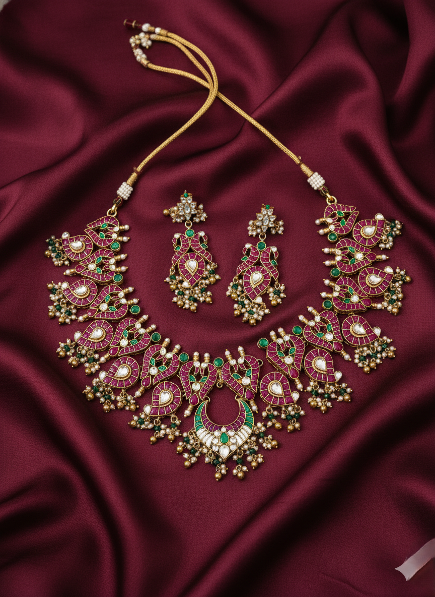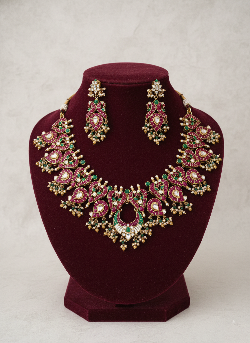Channel the splendor of the Mughal era with our Royal Mayura Meenakari Set. This piece is a celebration of traditional Indian craftsmanship, designed to be the focal point of a bridal or festive ensemble.