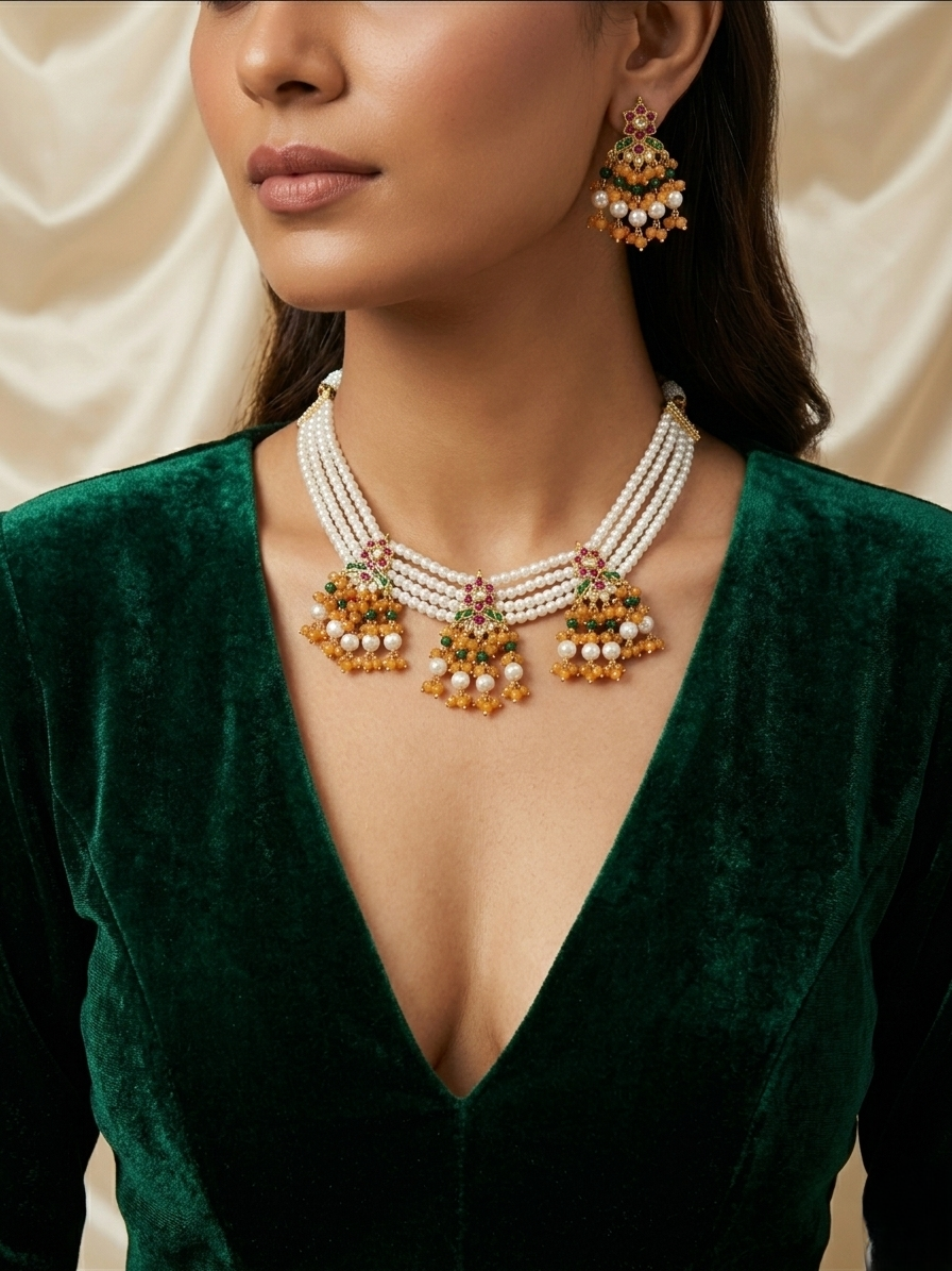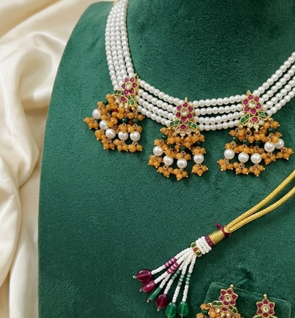 Elevate your ethnic look with this stunning Royal Pearl Floral Necklace Set, beautifully crafted with multiple strands of delicate pearls and intricate floral motifs. The design features elegant gold-toned detailing adorned with sparkling stones and pearl drops that create a graceful, luxurious finish. Paired with matching statement earrings and a stylish tassel tie-up, this set perfectly blends traditional charm with modern elegance.