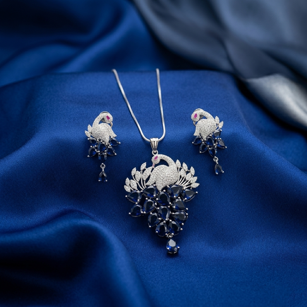 Exude grace and sophistication with this stunning Peacock-inspired jewelry set. Featuring a centerpiece pendant adorned with deep sapphire-blue teardrop stones and brilliant white zircon-style accents, this modern-luxe ensemble is paired with matching earrings for a truly elegant statement.