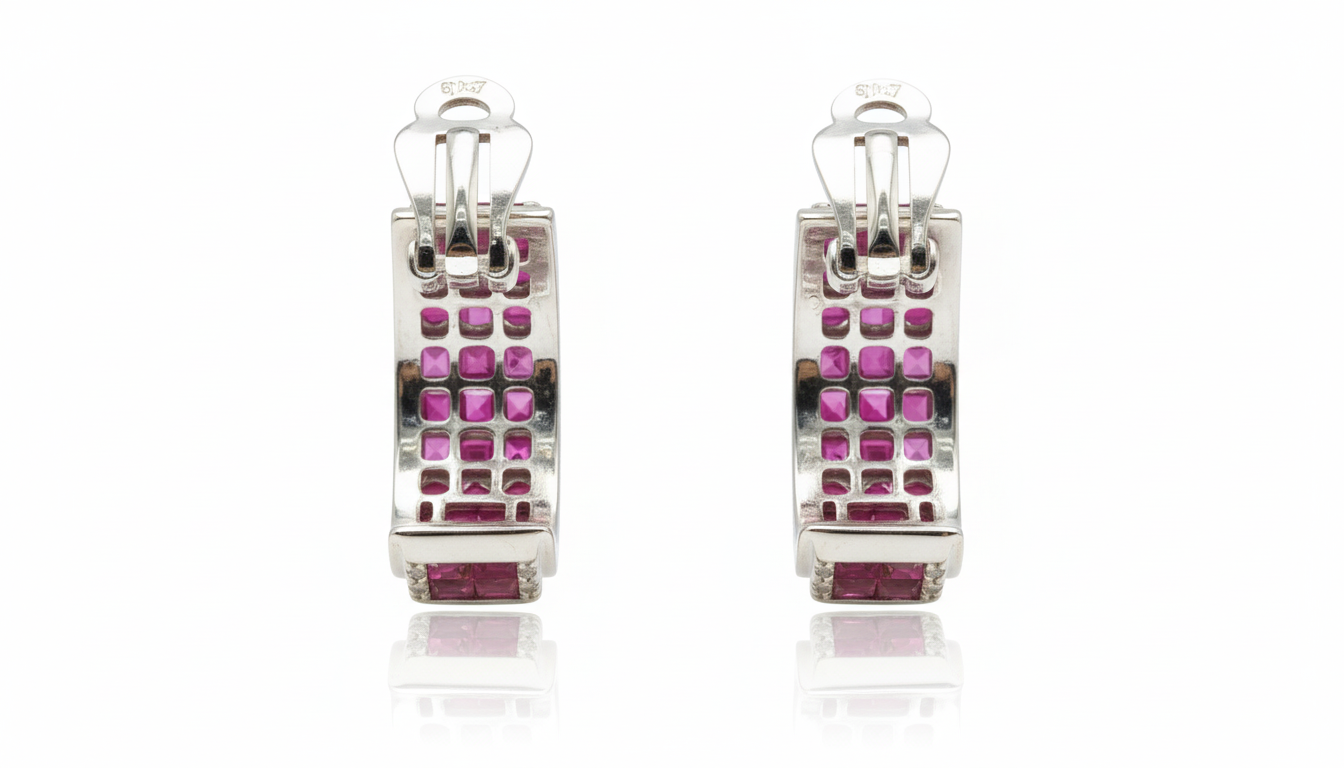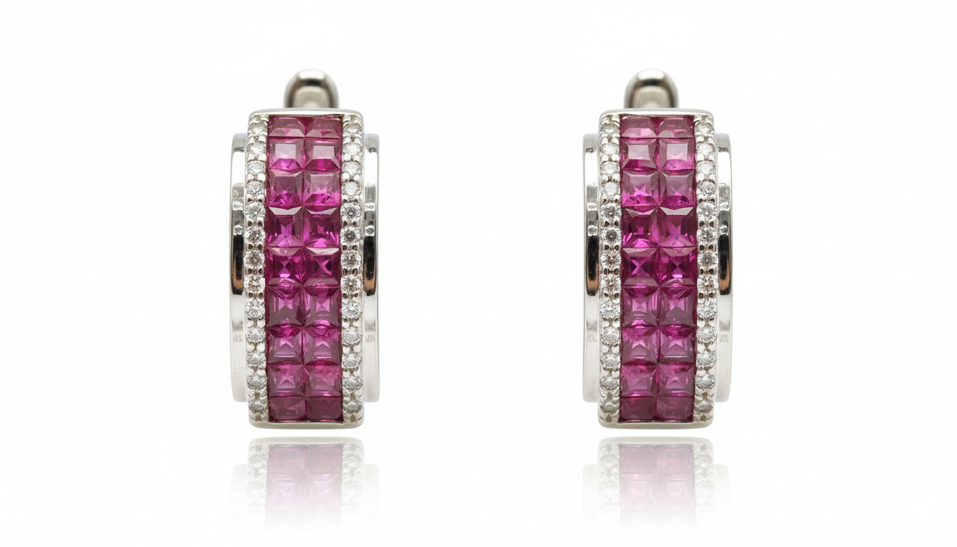 The center of each hoop showcases a triple-row mosaic of princess-cut rubies, meticulously placed in an invisible setting. This precision technique allows the gemstones to sit edge-to-edge without visible prongs, creating a smooth wall of velvety red. To enhance the brilliance, each side is framed by a delicate row of round brilliant-cut diamonds, all set in a high-shine white gold frame. The secure hinged design ensures a comfortable, close-to-the-ear fit perfect for any occasion.