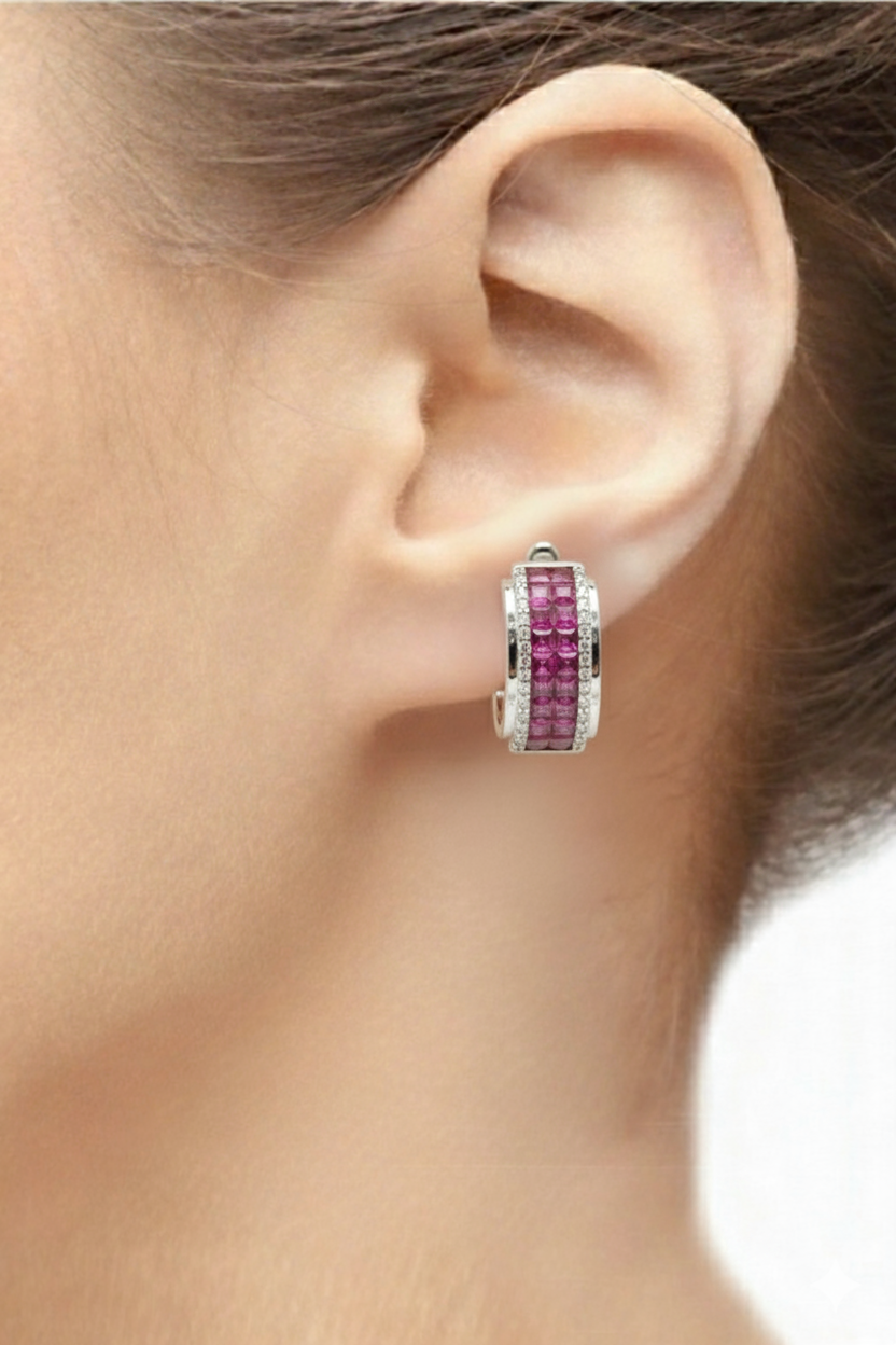 Elevate your jewelry collection with these bold huggie hoop earrings, featuring three rows of vibrant pinkish-red rubies in a seamless invisible setting. Flanked by shimmering diamond borders and crafted in polished white gold, these wide-profile hoops offer a luxurious, modern silhouette.