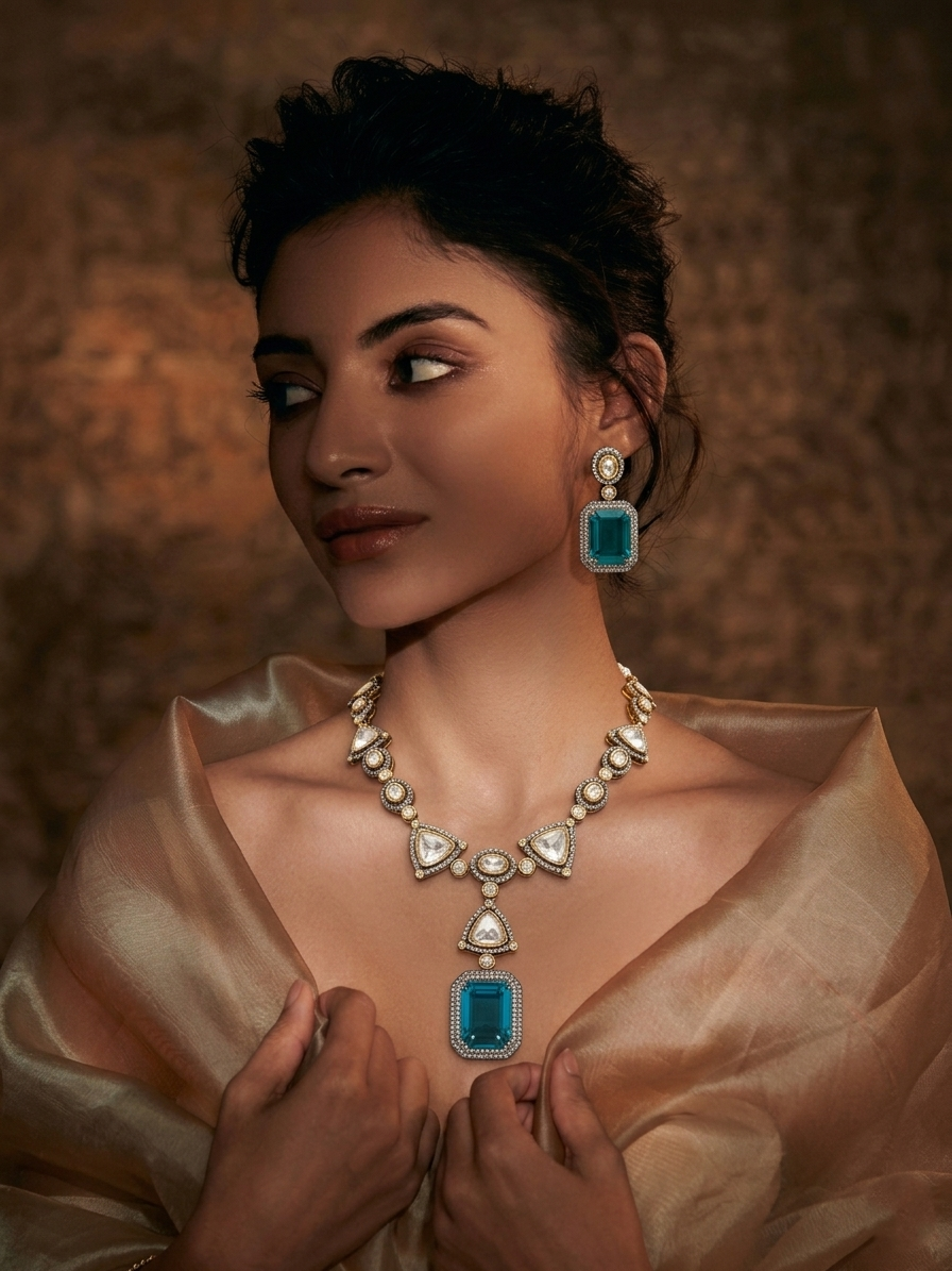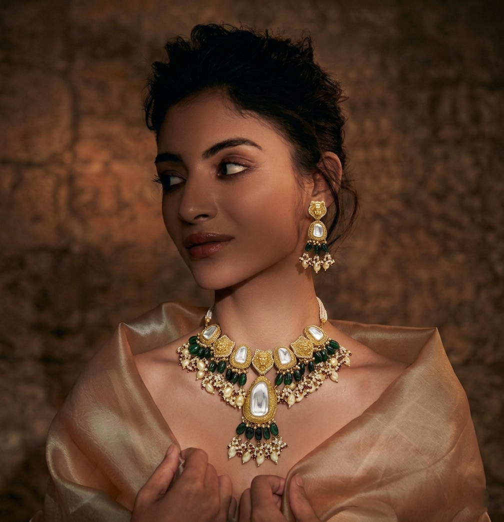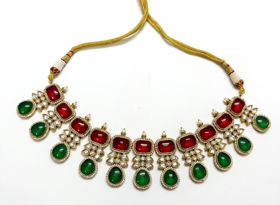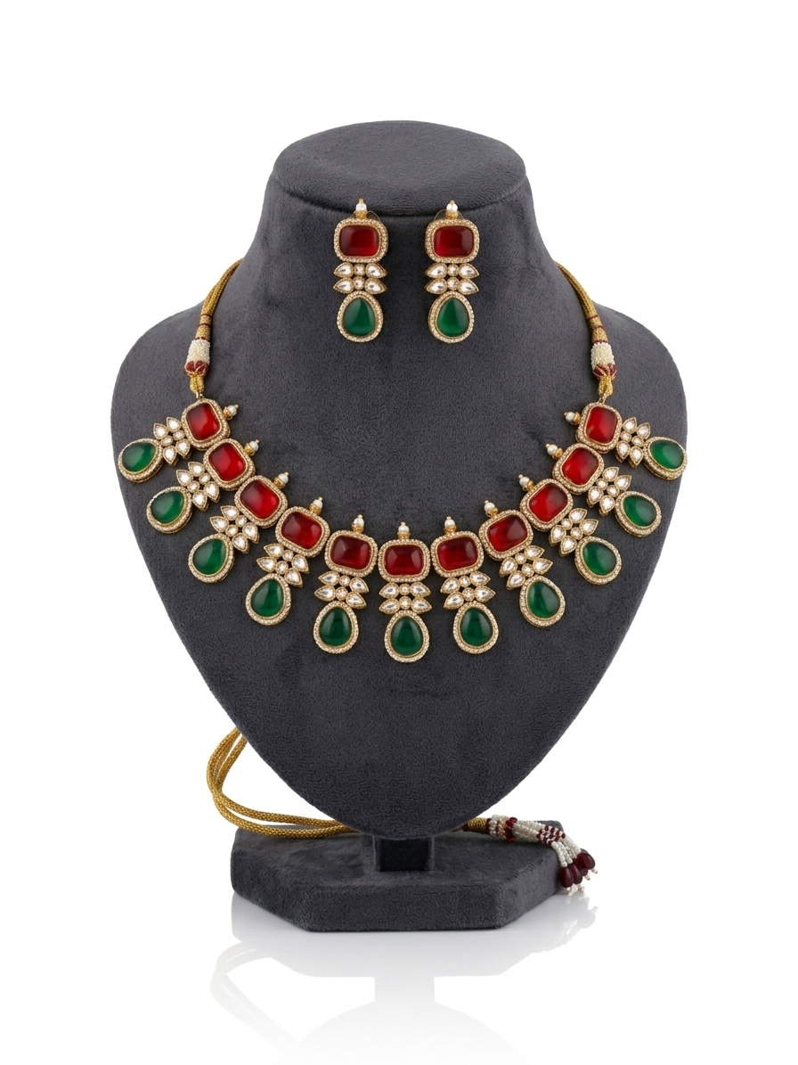 Between each crimson focal point lies a delicate crystalline floret, leading the eye to a majestic fringe of polished emerald-green teardrops. These droplets are suspended with grace, creating a rhythmic movement that captures the light with every turn. The set is perfectly completed with matching tiered drop earrings that mirror the necklace’s bold geometry and vibrant palette, offering a cohesive and regal aesthetic. Crafted for the modern connoisseur of traditional artistry, this suite is an ideal centerpiece for grand weddings and festive galas.