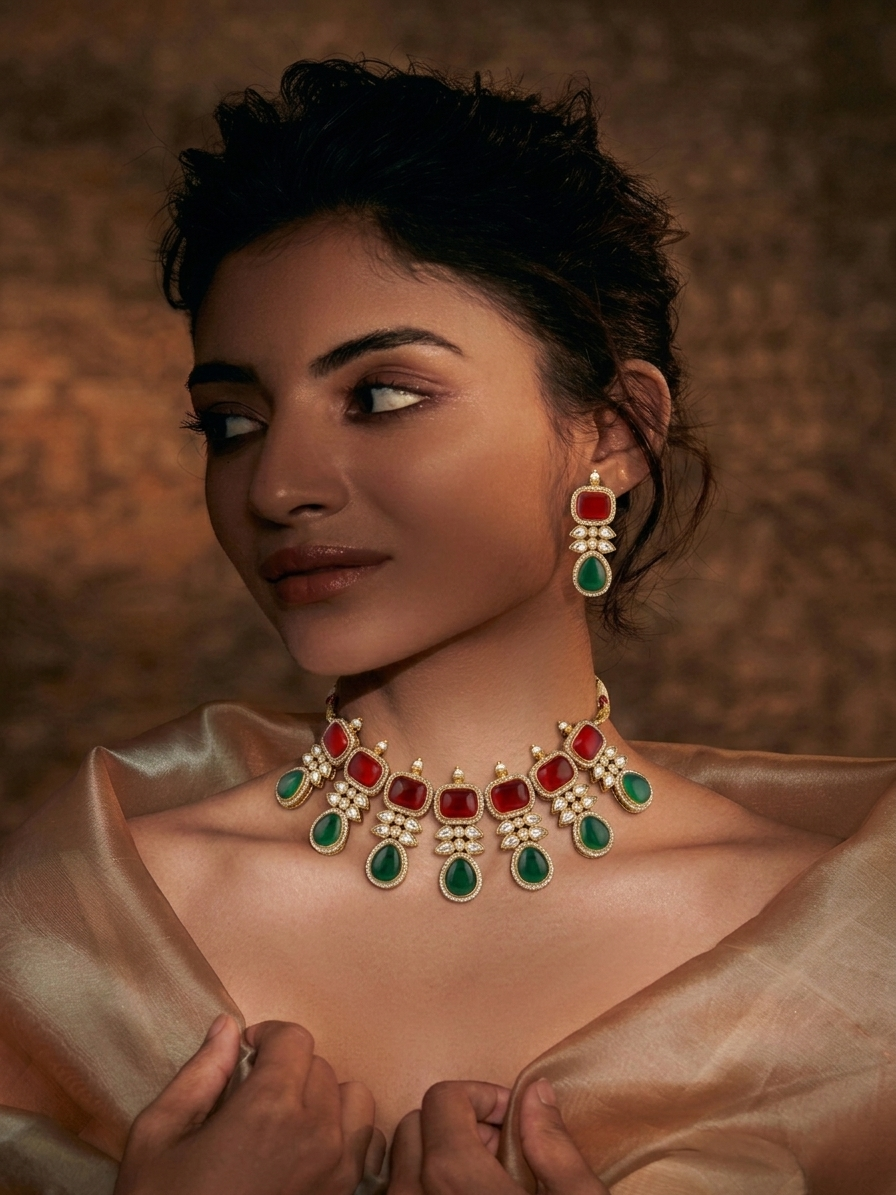 • Gemstones: Rich ruby-red squares, emerald-green teardrop beads, and brilliant-cut crystalline accents.