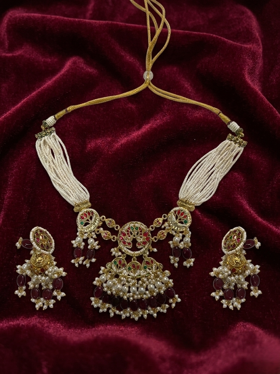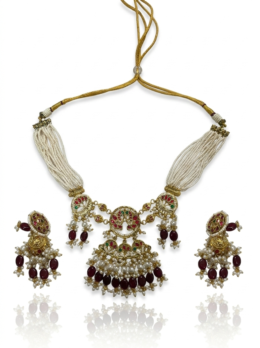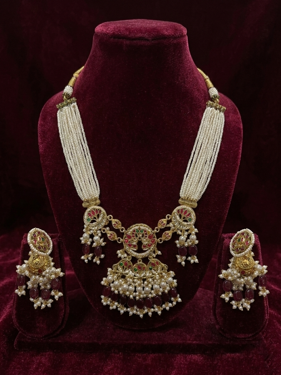 Pendant Artistry: The centerpiece is a large, circular Meenakari-style pendant featuring intricate peacock or floral motifs. It is inlaid with rich red and green stones (simulating rubies and emeralds) and bordered by a dense fringe of pearls and drop-shaped ruby beads.