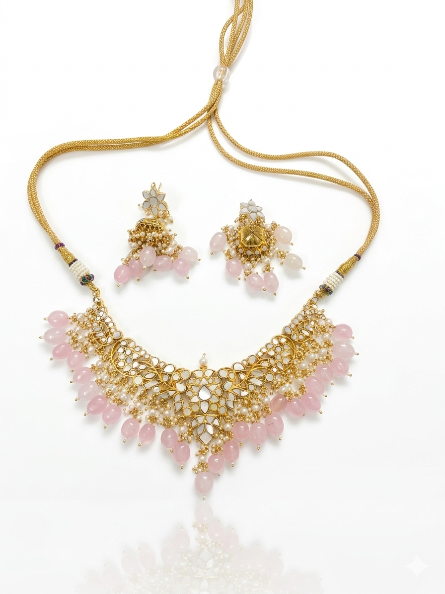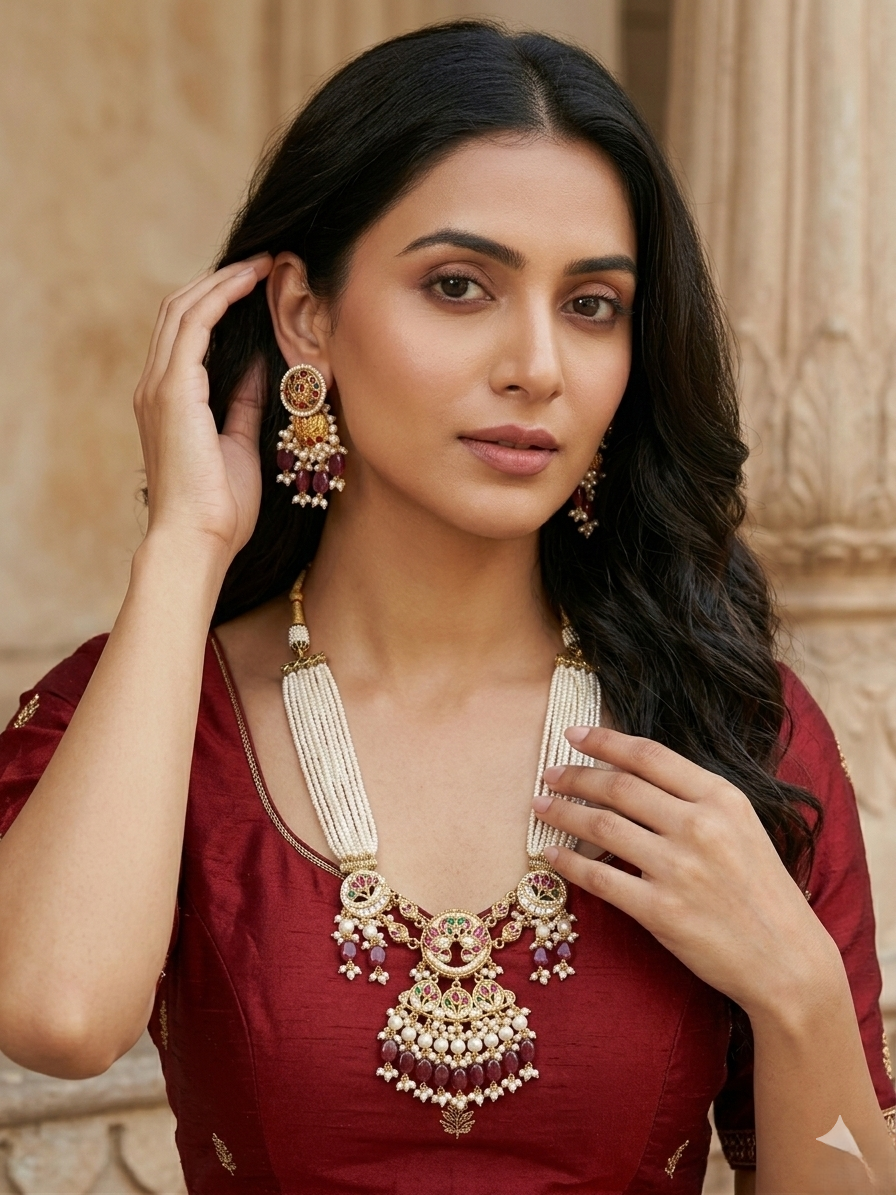 Versatility: Equipped with an adjustable gold zari dori, the necklace can be worn as a semi-choker or a longer “Raani Haar” (Queen’s necklace) style to suit different saree or lehenga necklines.