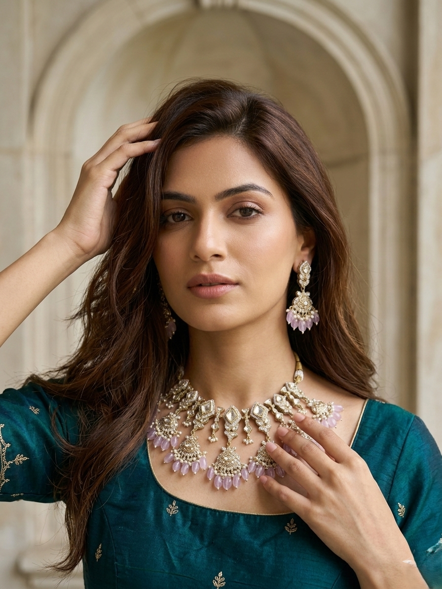 This exquisite jewelry set captures the essence of royal Indian craftsmanship through a thoughtful combination of texture and color.