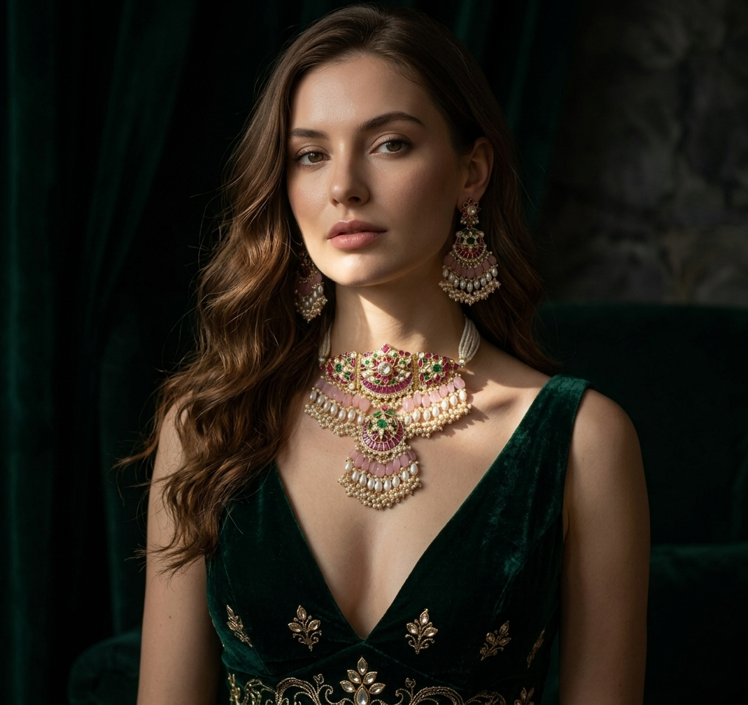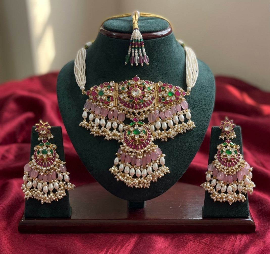 Style Tip: Pair this set with a deep-toned velvet lehenga or a classic gold-threaded saree to highlight the vibrant gemstone contrast.