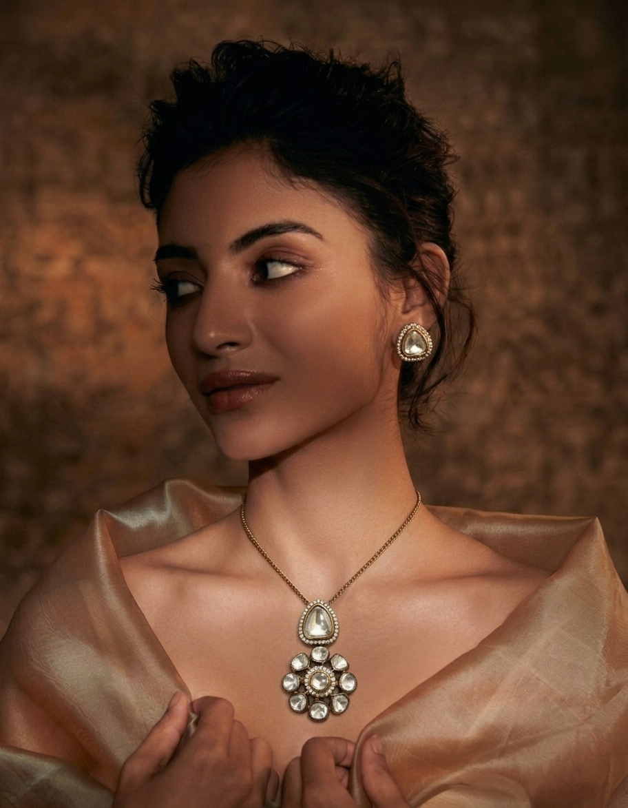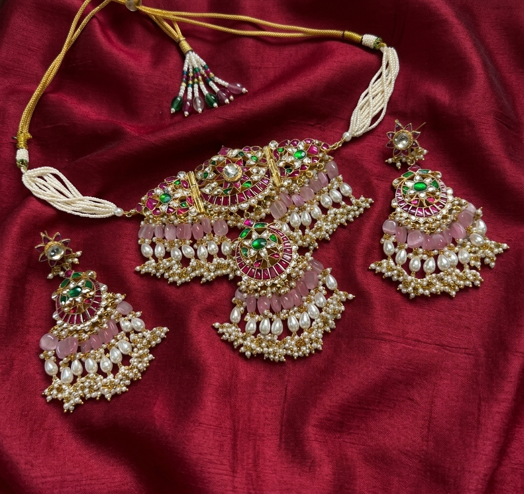 The focal point is a grand, multi-tiered circular pendant that mirrors the intricate stone-setting of the choker, drapes elegantly with an imperial presence. The set is brought to life by a decadent fringe of soft rose-quartz-toned beads and cascading ivory pearls, adding a sense of fluid movement and timeless romance. Suspended from multiple strands of fine seed pearls and completed with matching chandelier-style earrings and a coordinating maang tikka, this suite is the ultimate statement piece for grand weddings and royal receptions.