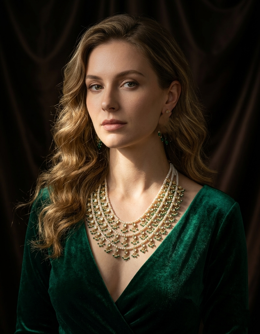 Gemstones: Vibrant rubies, forest-green emeralds, soft rose-pink beads, and high-luster ivory pearls.