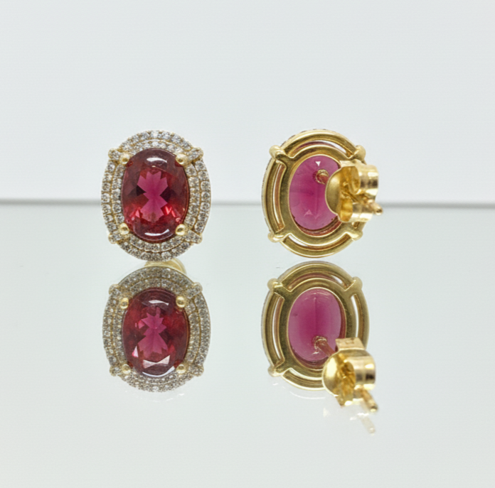Elegant gold-toned stud earrings featuring a vibrant oval-cut crimson stone surrounded by a double halo of shimmering pavé crystals.