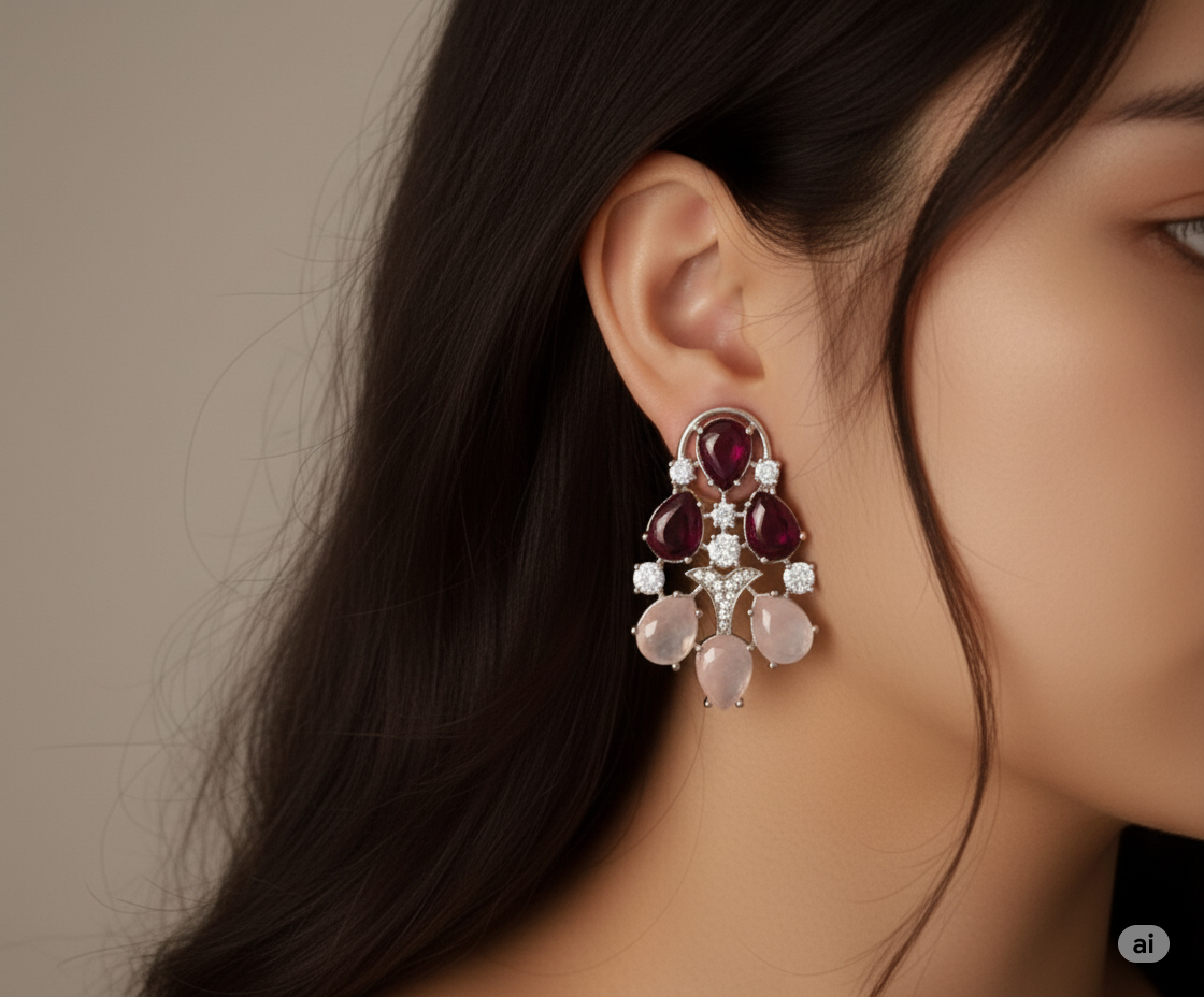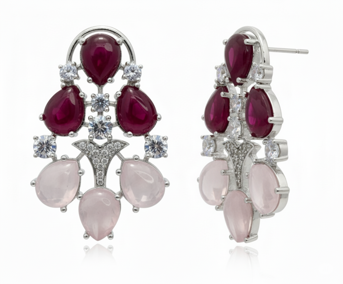 Exquisite multi-gemstone stud earrings featuring a striking combination of deep ruby-red and soft rose quartz teardrops. A sophisticated silver-finish design accented with sparkling white stones for a regal and romantic look.