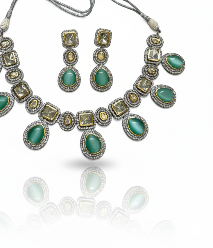 Step into a world of refined luxury with the Cerulean Serenity Set. This high-fashion choker is anchored by a magnificent, oversized oval sapphire-blue stone, held in a delicate gold-toned pavé setting that captures every glimmer of light.