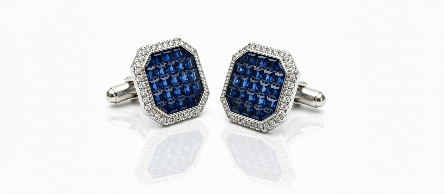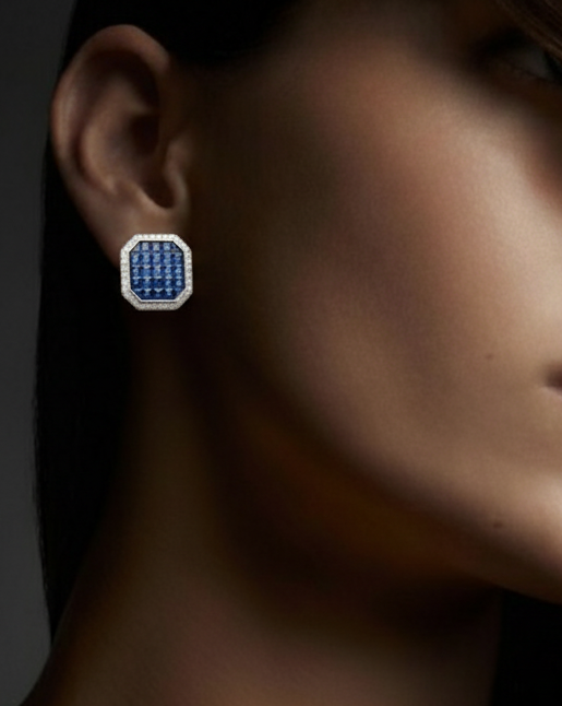 Make a sophisticated statement with these magnificent octagonal stud earrings, featuring a seamless mosaic of deep royal blue sapphires. Framed by a brilliant halo of shimmering diamonds and finished in polished white gold, these studs blend architectural precision with timeless luxury.