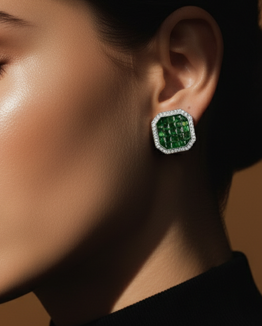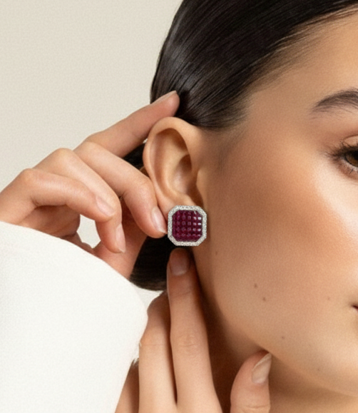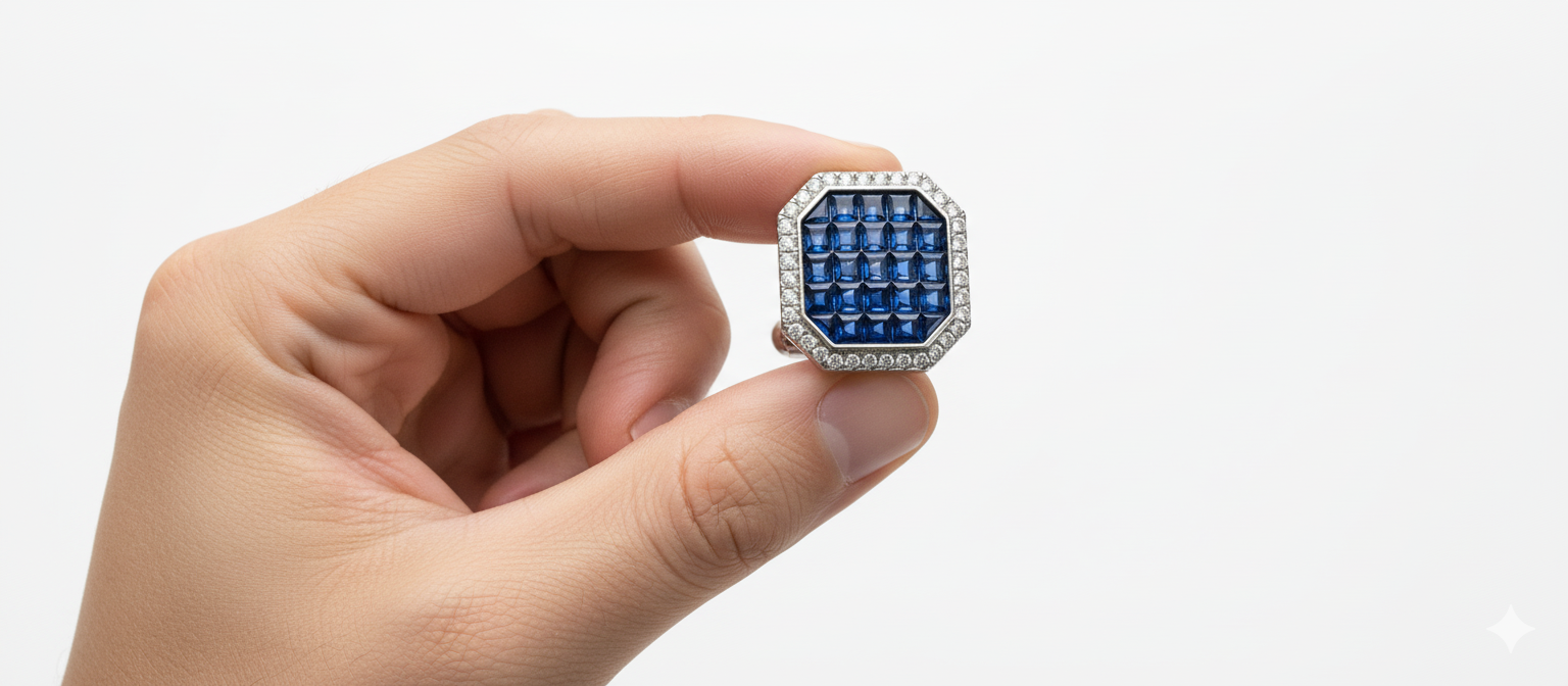 Elevate your fine jewelry collection with our Sapphire Octagon Majesty Earrings. These statement studs are designed for maximum impact, showcasing an intricate arrangement of vibrant blue gemstones in a modern, geometric silhouette.