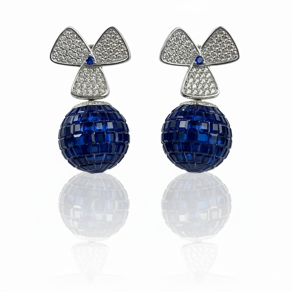 Make a grand statement with these architectural drop earrings, featuring a magnificent sphere of invisibly set blue sapphires. Suspended from an elegant tri-fan stud encrusted with brilliant diamond pavé, these earrings offer a bold, three-dimensional silhouette that defines modern high-jewelry luxury.