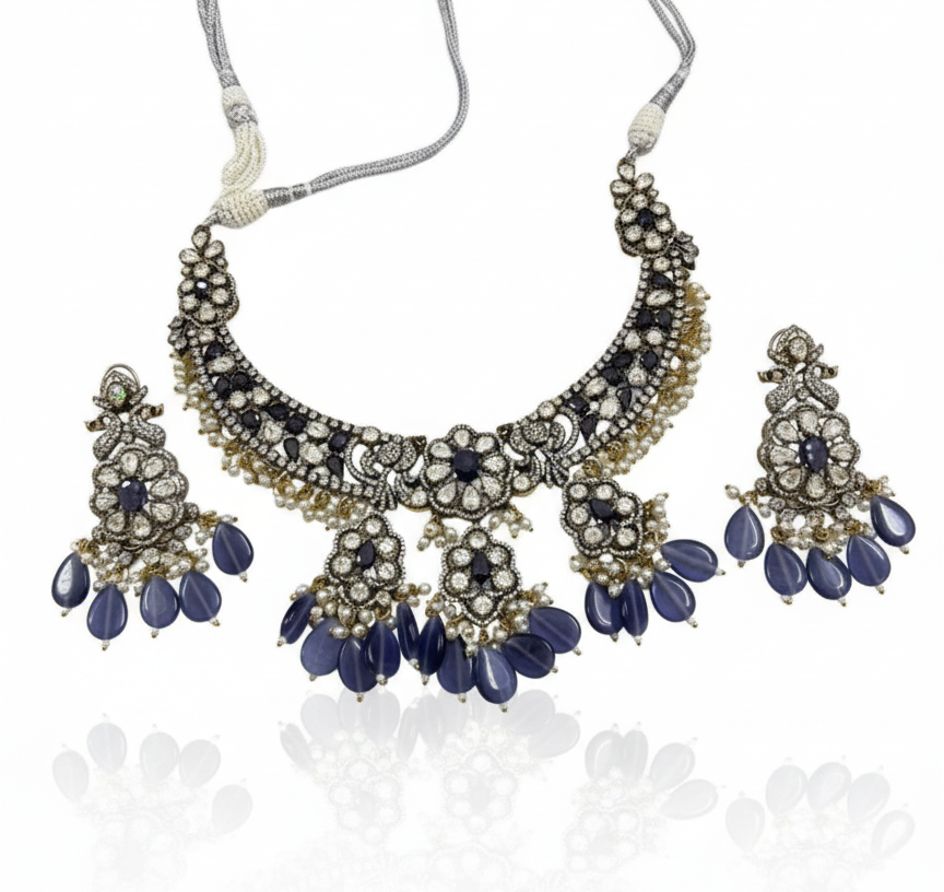 The Necklace: A striking collar-style piece that features a central floral medallion flanked by intricate, pave-encrusted link patterns. The silver-toned setting provides a modern, diamond-like brilliance that beautifully complements the deep blue accents.