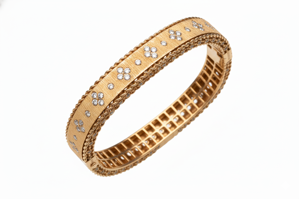 The architectural silhouette is defined by dual twisted rope edges, adding a classic European touch to the design. The interior of the bangle features a precision-engineered open-work gallery for lightweight comfort and maximum light exposure to the stones. Finished with a seamless integrated hinge and safety clasp, this bangle is an heirloom-quality addition to any high-end jewelry collection.