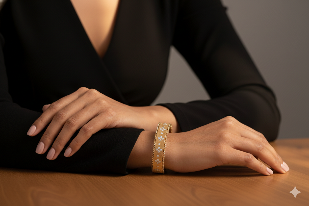 This exquisitely crafted bangle is a study in sophisticated contrast. The central band is treated with a hand-applied satin-brushed technique, creating a soft, matte luster that serves as the perfect canvas for the shimmering round brilliant-cut stone clusters. These floral-inspired motifs are precisely set to mimic a garden in bloom, punctuated by individual bezel-set accents for added depth.