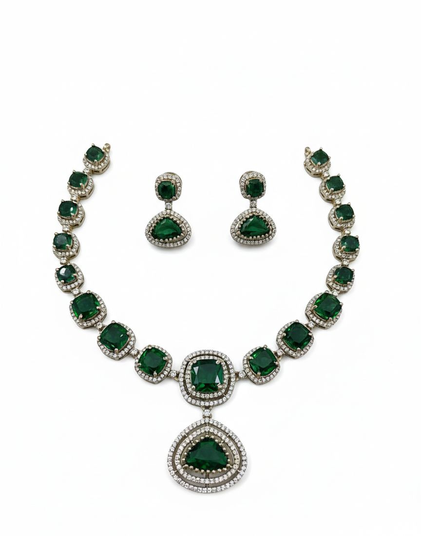 Indulge in the allure of classic royalty with this breathtaking statement necklace. Designed for maximum impact, this piece combines the rich, deep hues of emerald with the icy brilliance of precision-set white stones.