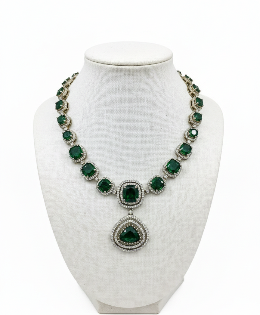 • Design & Artistry: The necklace features a graduated strand of square cushion-cut emerald stones, each meticulously framed by a pave-set halo. The center transitions into a larger square link that suspends a dramatic, oversized teardrop pendant, creating a focal point of unmatched elegance.