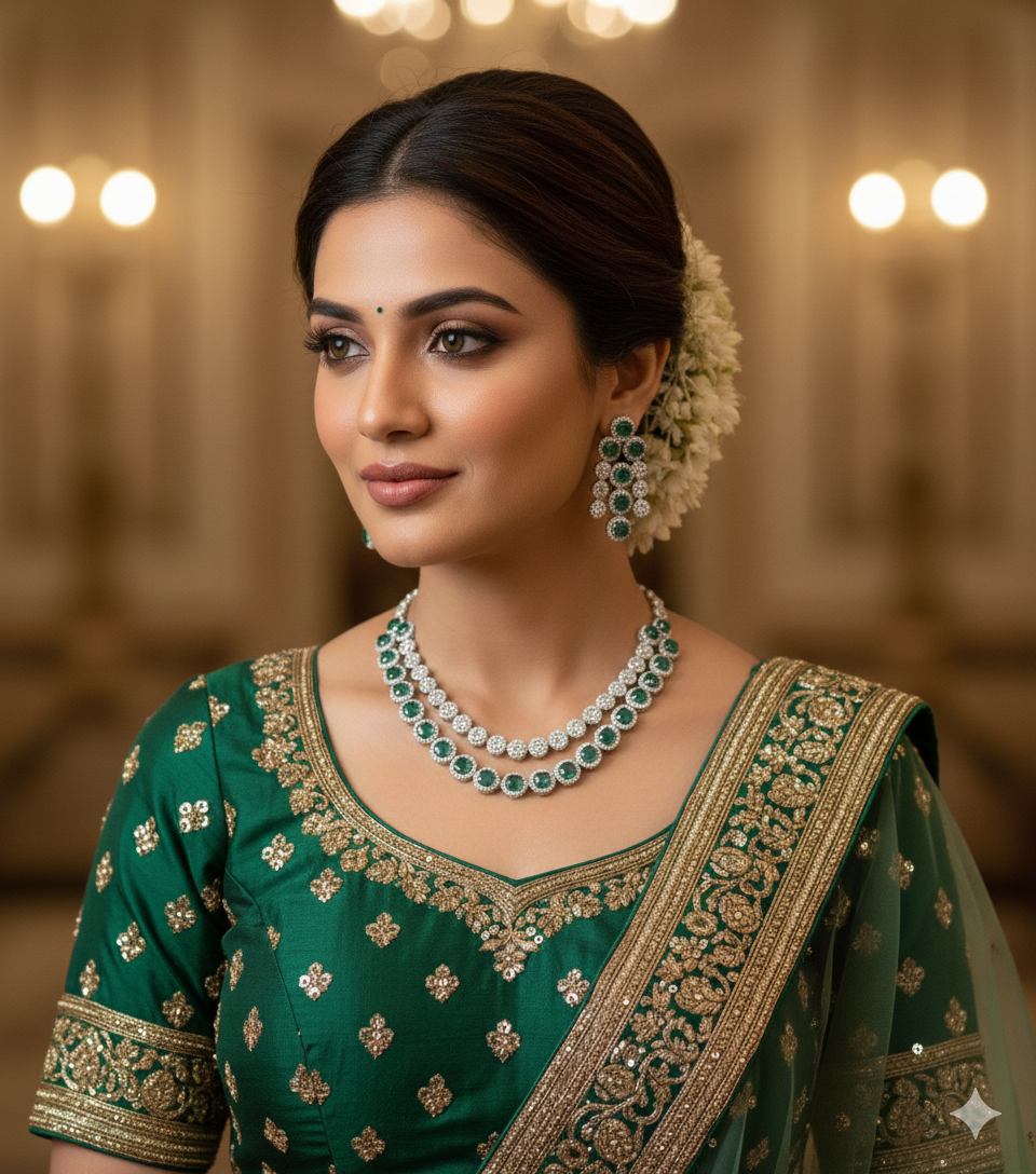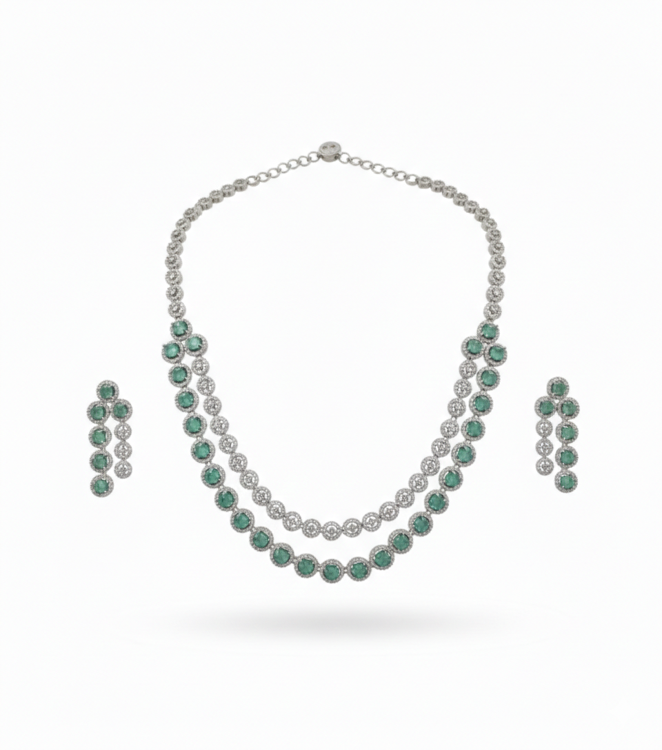 A contemporary masterpiece featuring deep emerald-green stones set in a tiered silver-finish frame. This set utilizes clean geometric lines and brilliant white crystal halos to create a sophisticated, high-fashion look.