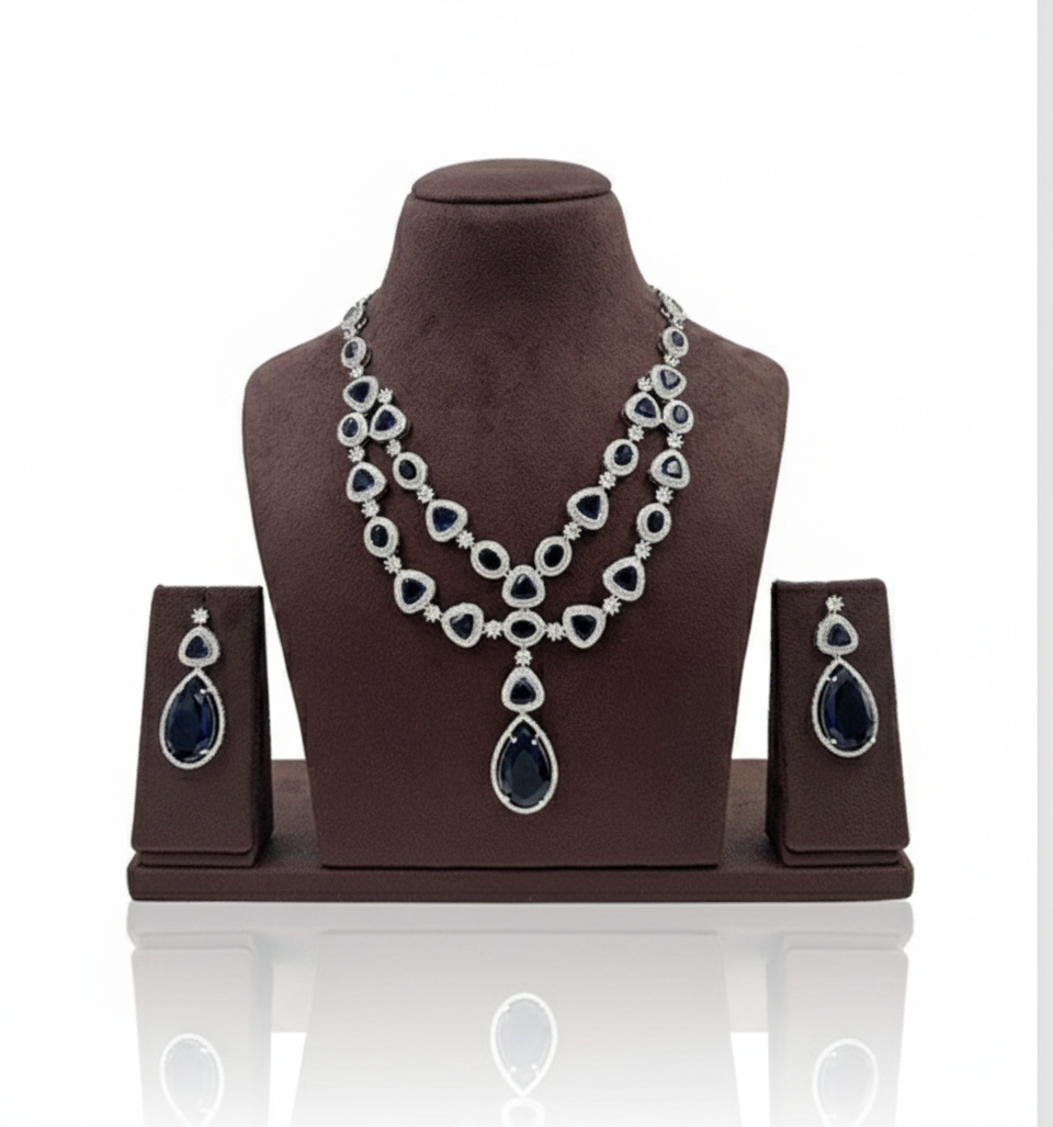 Redefine modern luxury with this avant-garde necklace set that perfectly balances structured patterns with timeless gemstone hues.