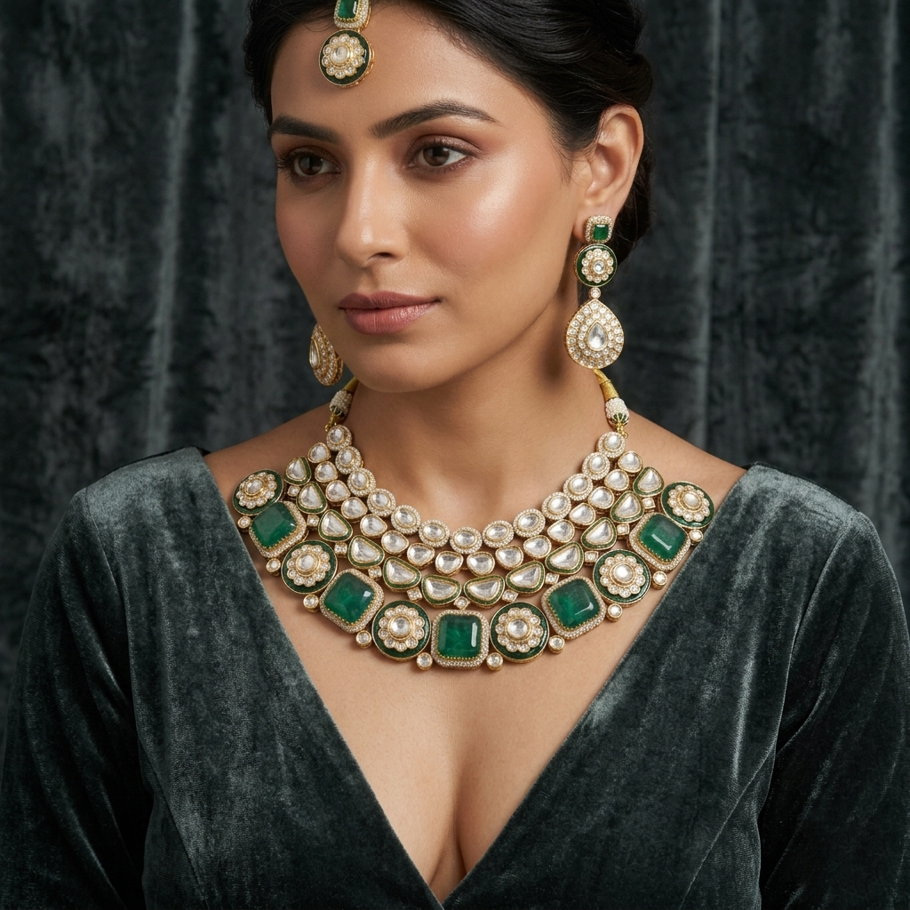 The Quintessential Bridal Choice: With its massive scale and classic color palette, this set is the perfect accompaniment to heavy Zardosi lehengas or traditional Banarasi silks in shades of ivory, maroon, or gold.