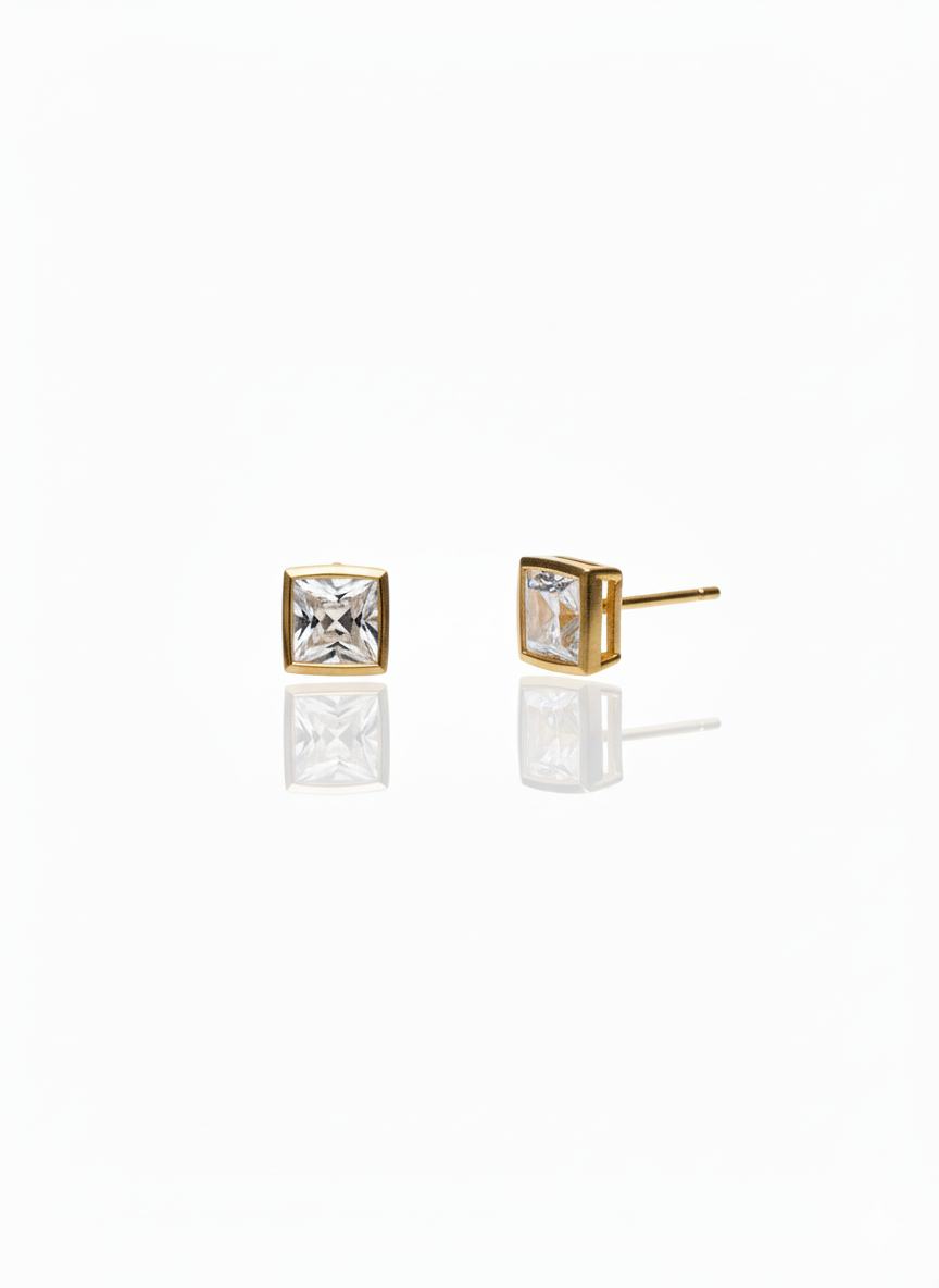 • Design & Precision: Each earring features a premium princess-cut crystalline stone, precision-faceted for maximum fire and brilliance. The stone is securely held within a polished gold-plated bezel frame, which not only protects the edges but also provides a contemporary, seamless look.