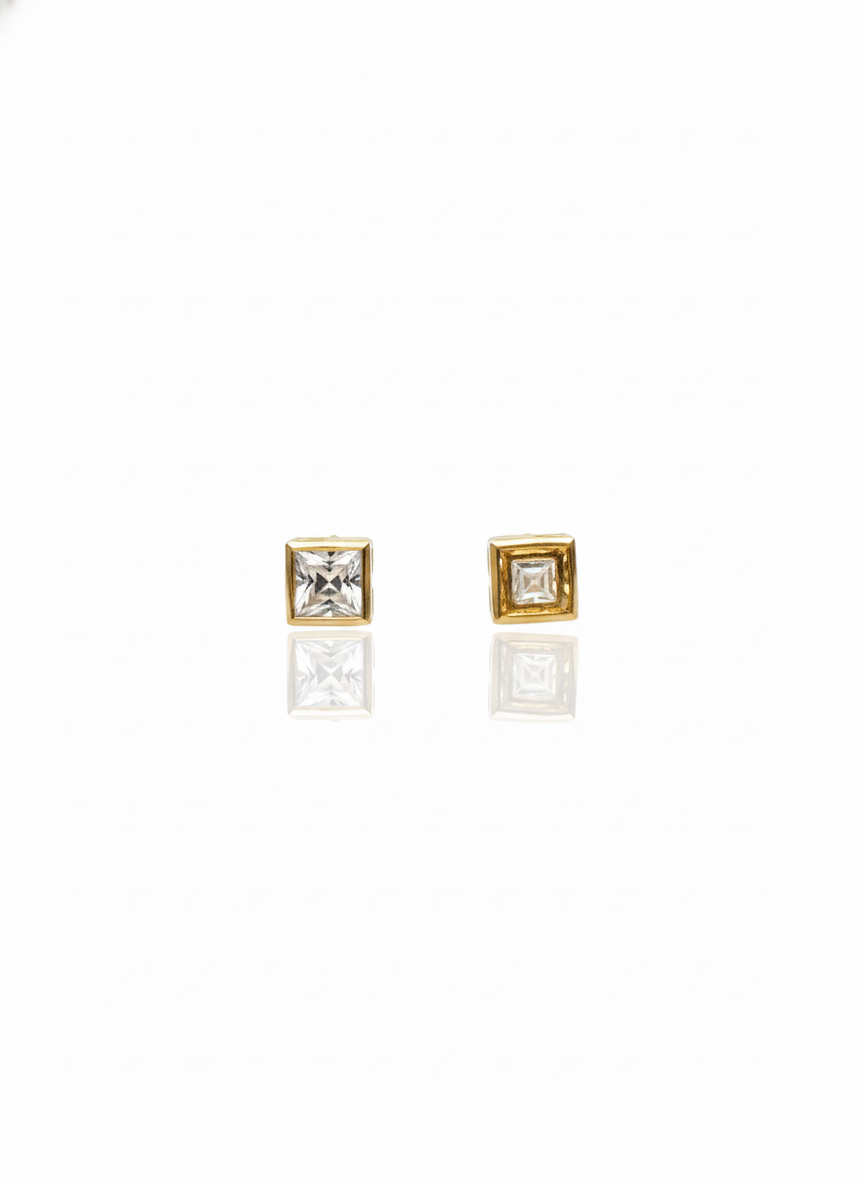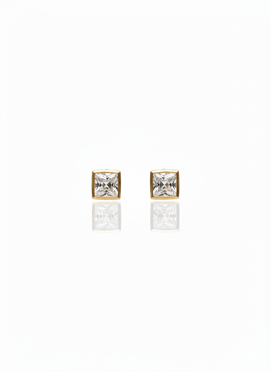 A masterclass in minimalist luxury, these square-cut stud earrings feature a brilliant, high-clarity stone encased in a sleek gold-toned bezel setting. Their clean lines and modern geometric silhouette make them an essential accessory for adding a touch of sophisticated sparkle to any look.