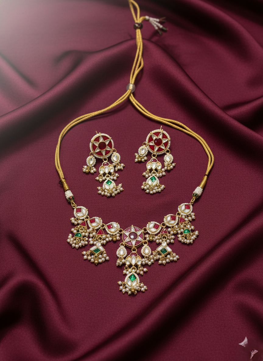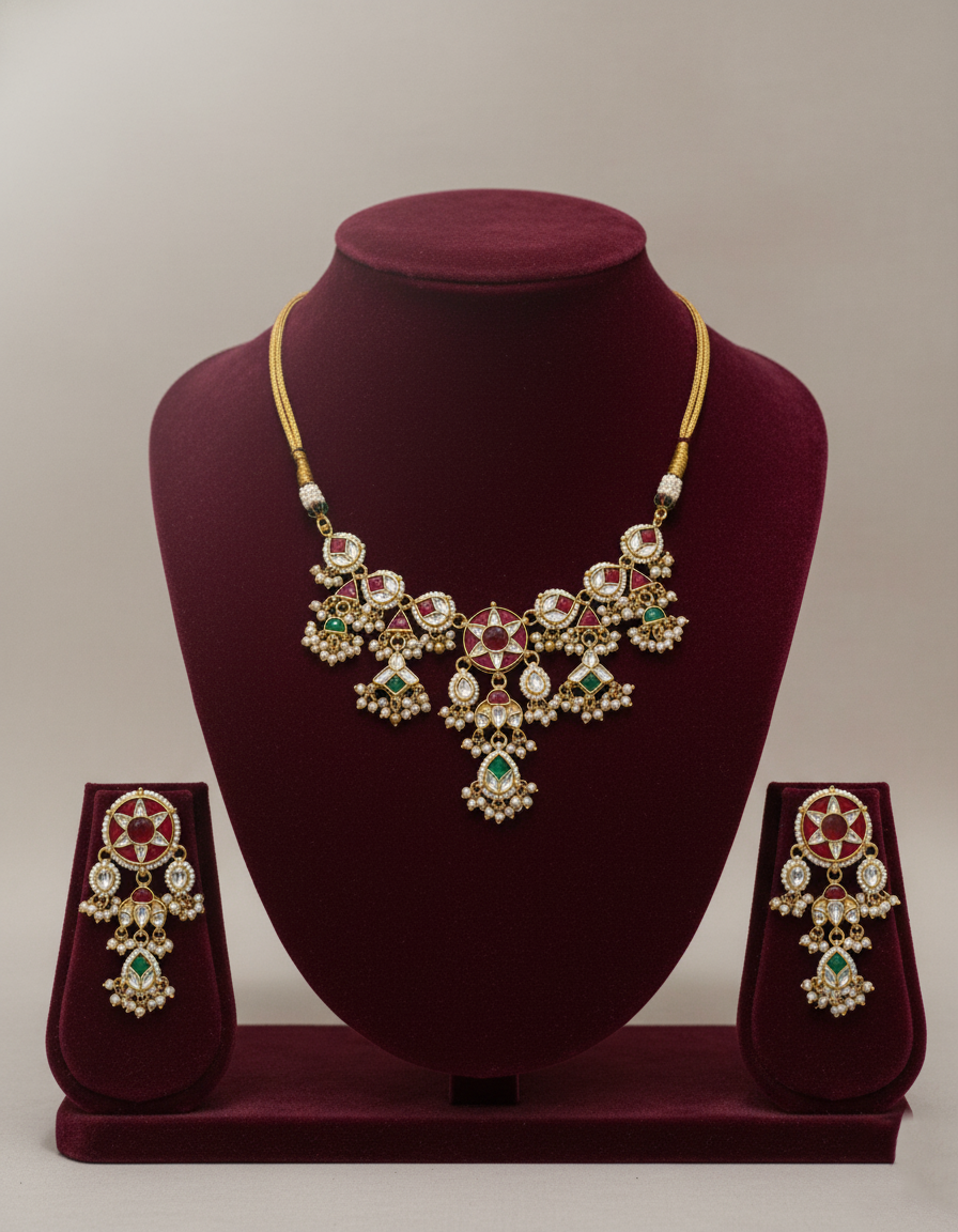 Star-Motif Meenakari Kundan & Navaratna-Style Set