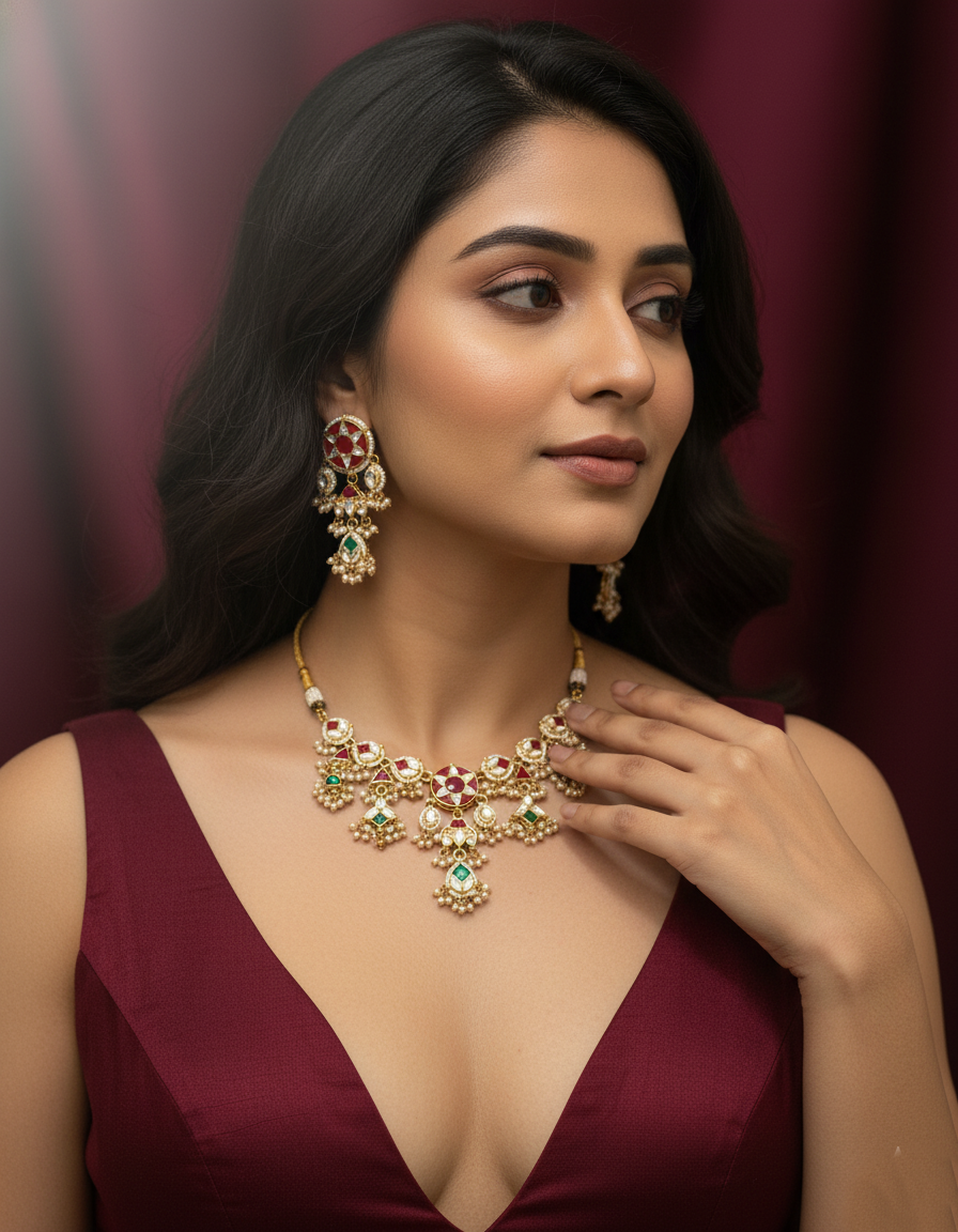Capture the charm of Rajasthani craftsmanship with this intricately detailed jewelry set, designed to be the centerpiece of your ethnic wardrobe.
