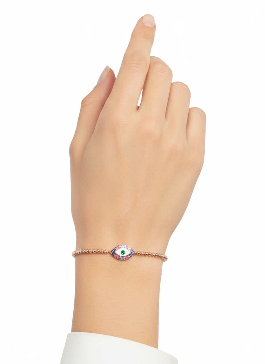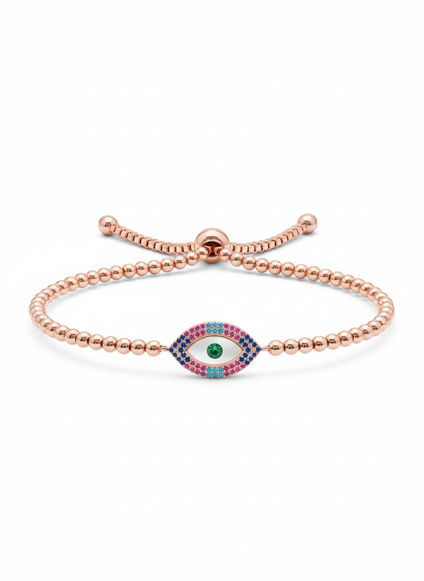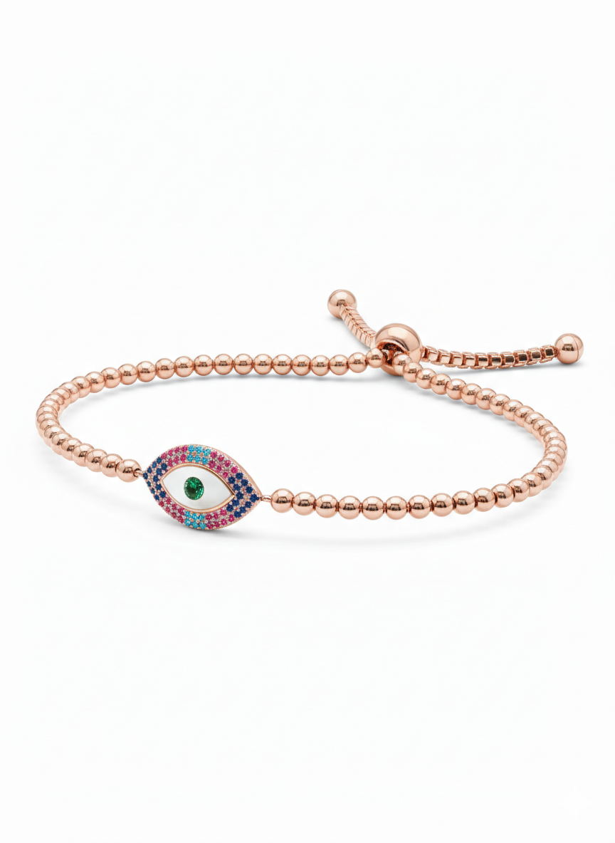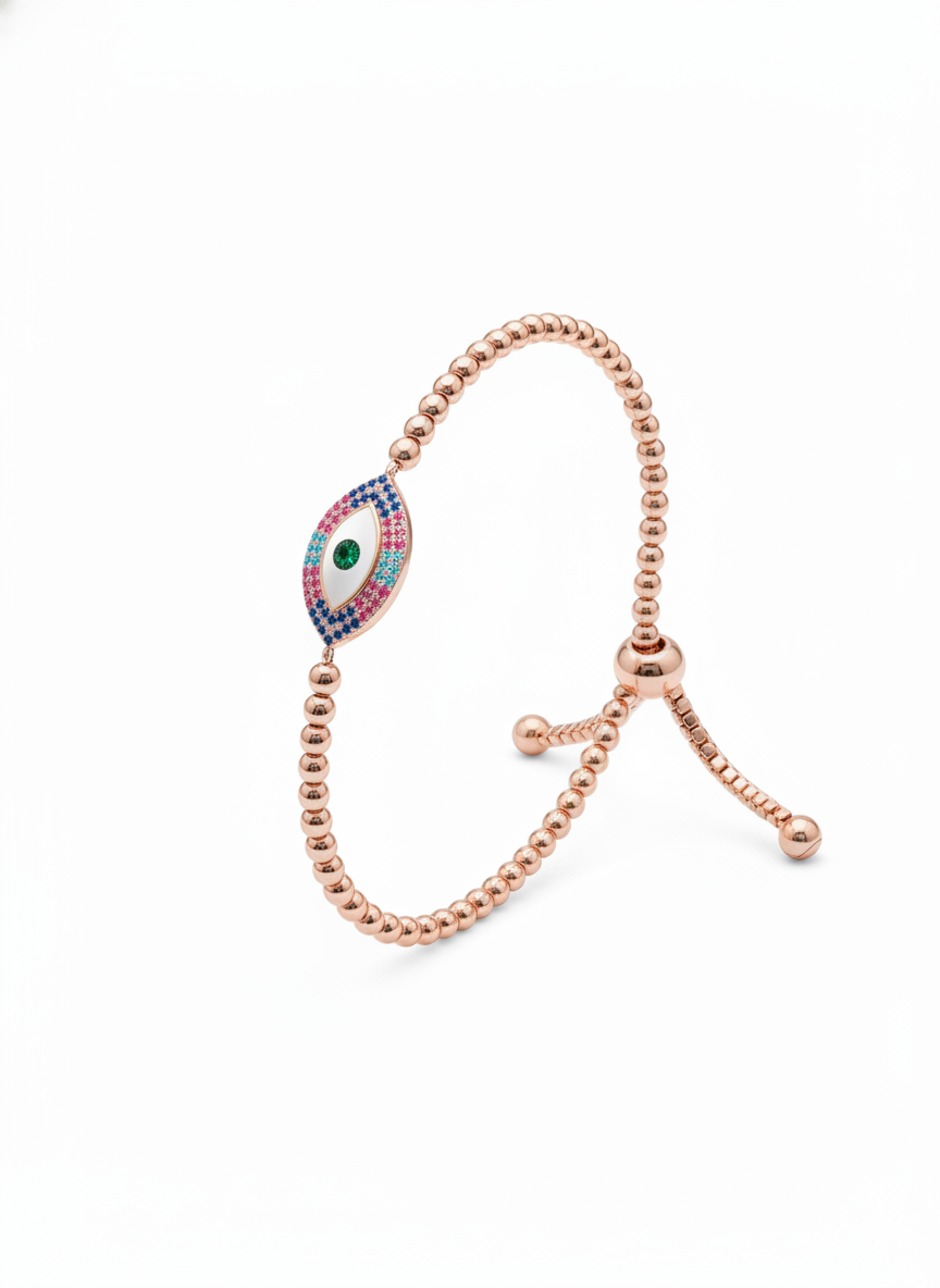 Crafted in a warm rose gold finish, the centerpiece is integrated into a delicate yet durable box chain. The innovative sliding bolo clasp ensures a secure and personalized fit, allowing the bracelet to transition seamlessly between different wrist sizes. Finished with two polished rose gold beads, this piece stands beautifully on its own or as the centerpiece of a luxury bracelet stack.
