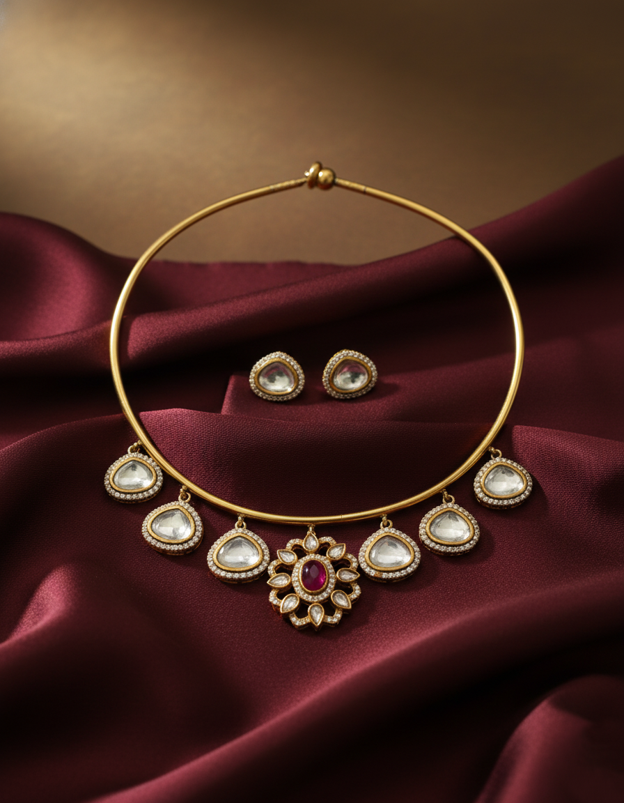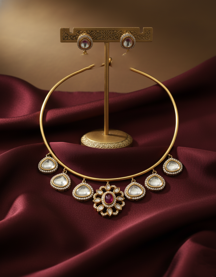 The Necklace: A rigid, gold-toned collar (Hasli) featuring a smooth, polished finish. It is adorned with seven dangling pear-shaped Polki (uncut diamond) charms, each bordered by a delicate halo of micro-crystals. At the very center sits a majestic floral medallion, anchored by a deep ruby-red oval cabochon and surrounded by petal-shaped Polki accents.