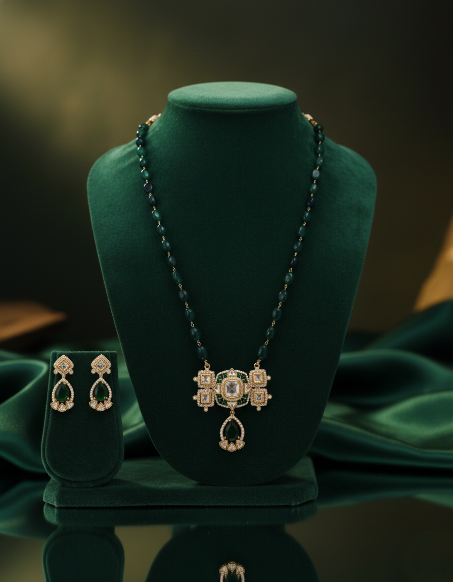 The Earrings: Complementary statement drops that mirror the design of the pendant’s base. They feature a floral-shaped stud and a peach cabochon center, finished with matching drop-bead fringes for a coordinated and high-impact look.