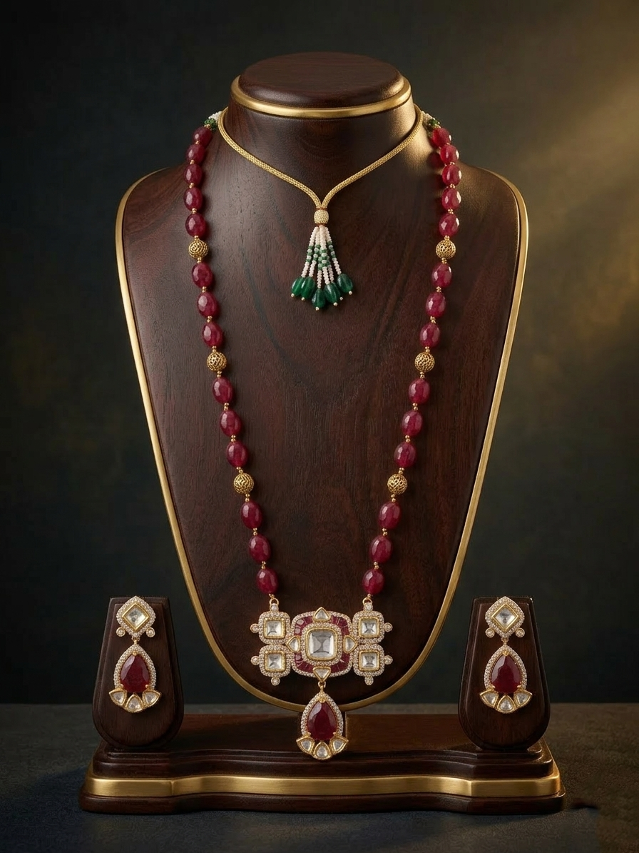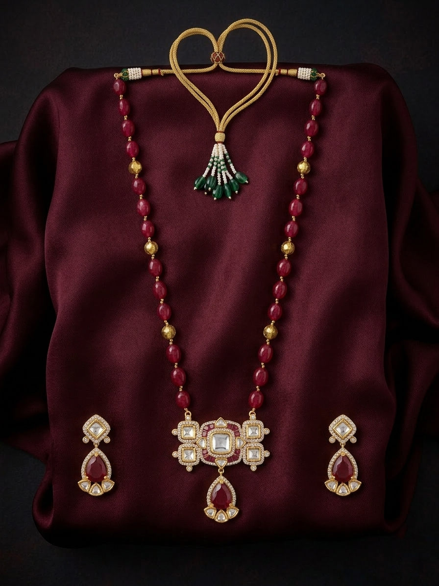 A majestic long-string jewelry set featuring rich crimson beads and a geometric Polki-studded pendant. This set perfectly balances traditional artistry with modern structure, making it a standout choice for festive attire or bridal occasions.