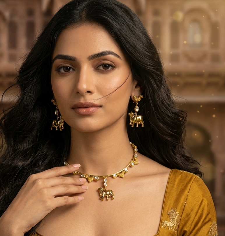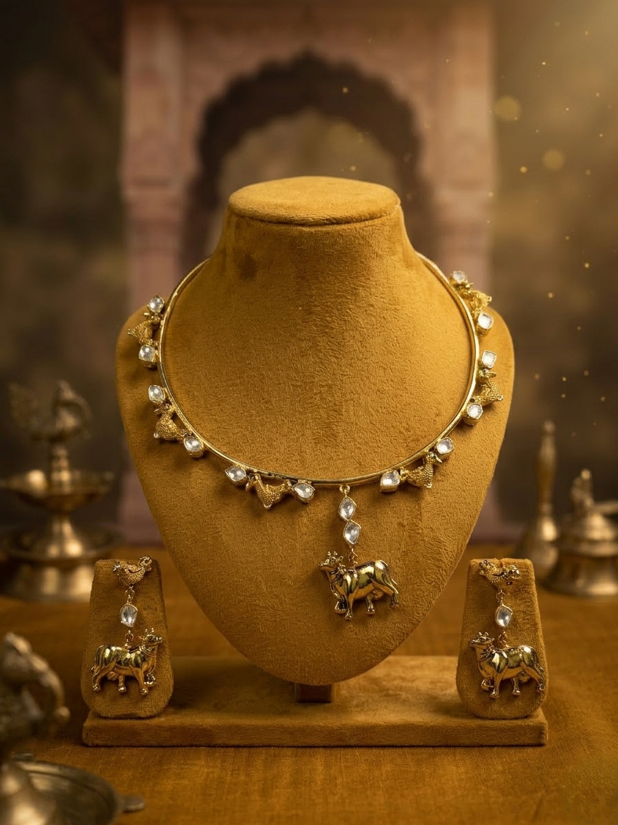 The Aesthetic: Crafted with an antique gold-toned finish, this set perfectly balances the weight of traditional temple art with the light-catching brilliance of faceted stones.
