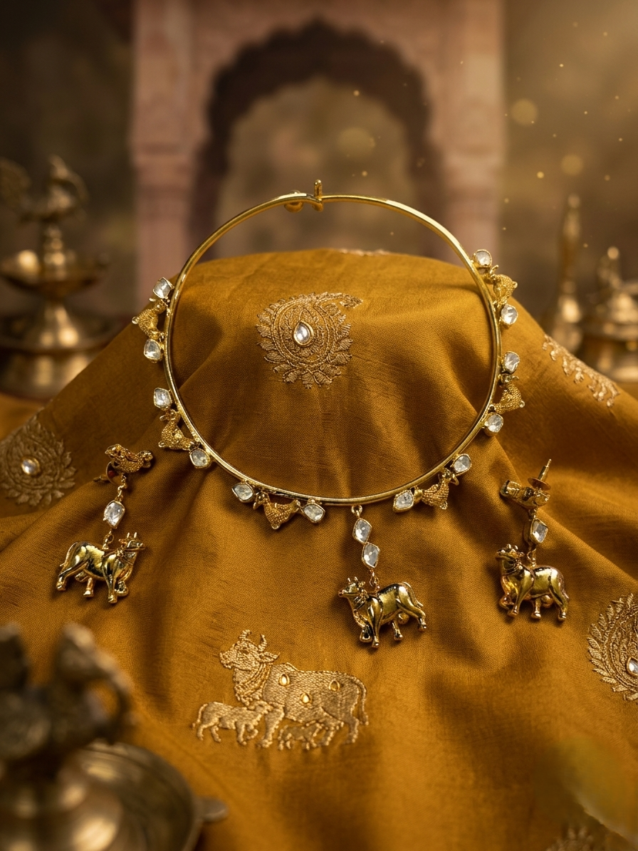 A regal antique-gold Hasli jewelry set featuring an intricately carved temple-style pendant with emerald and ruby accents. Complemented by cascading Polki drop earrings, this set is a masterpiece of traditional craftsmanship, ideal for grand weddings and religious festivities.