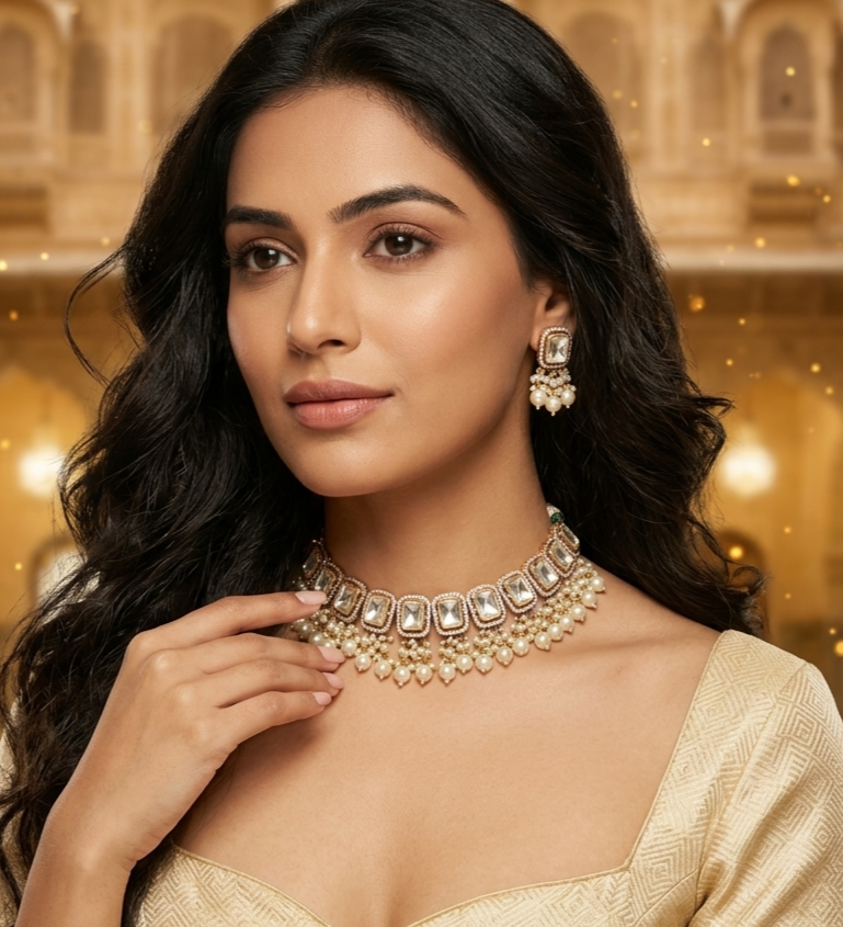 The Earrings: Matching triple-tiered drop earrings mirror the necklace’s aesthetic. They feature a square-cut stud, a textured geometric middle-link, and a large pear-cut Polki drop, providing an elegant, elongated silhouette.
