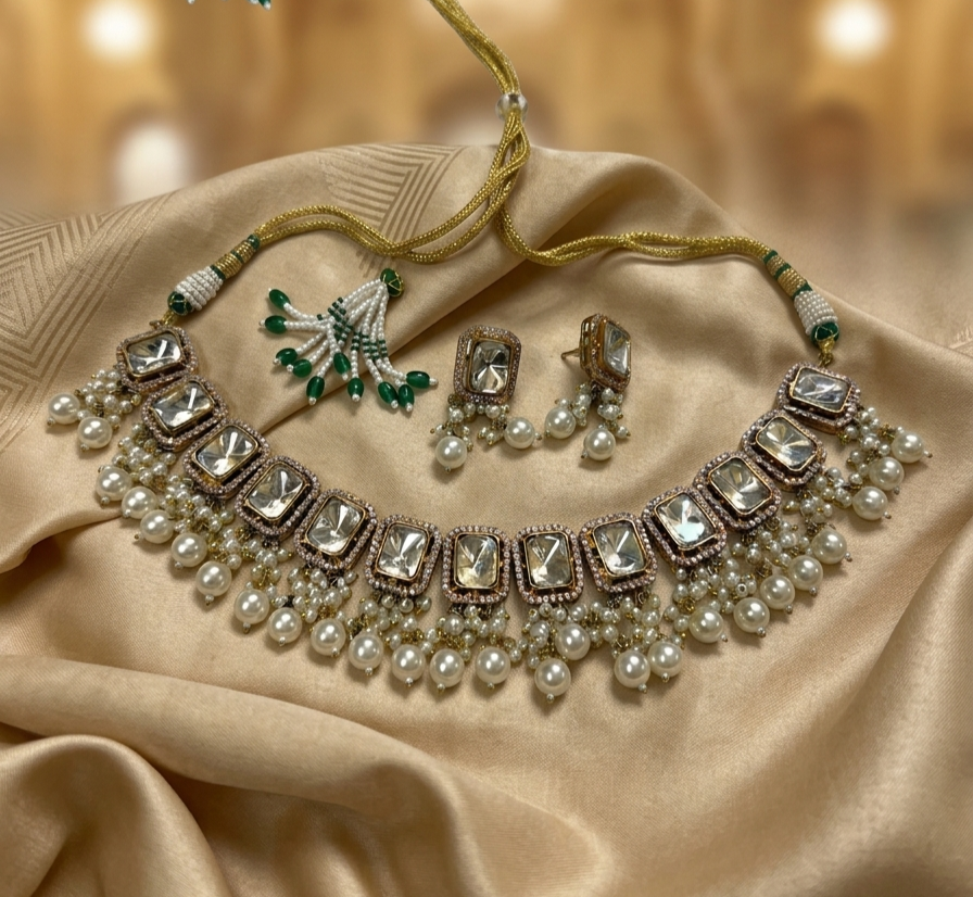 The Earrings: Matching Chandbali (crescent-shaped) earrings that mirror the choker’s panels. They feature a floral Polki stud leading to a green enamel crescent, bordered by a delicate pearl and green bead fringe for a coordinated, high-impact appearance.