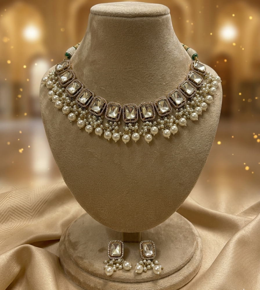 This majestic choker set is designed for a grand, celebratory look, drawing inspiration from royal palace motifs and traditional floral artistry.