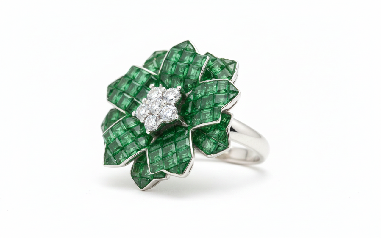This striking piece is a celebration of geometric precision and botanical elegance. Designed to mimic the layers of a blooming flower, the ring showcases an array of step-cut and custom-faceted emeralds. These stones are meticulously arranged in a tiered, mosaic-like fashion to create textured petals that catch the light from every angle.