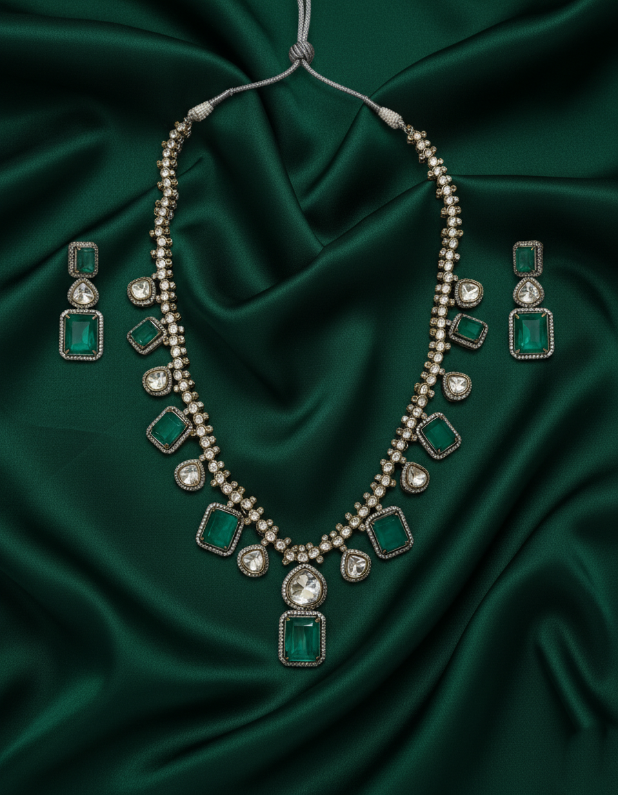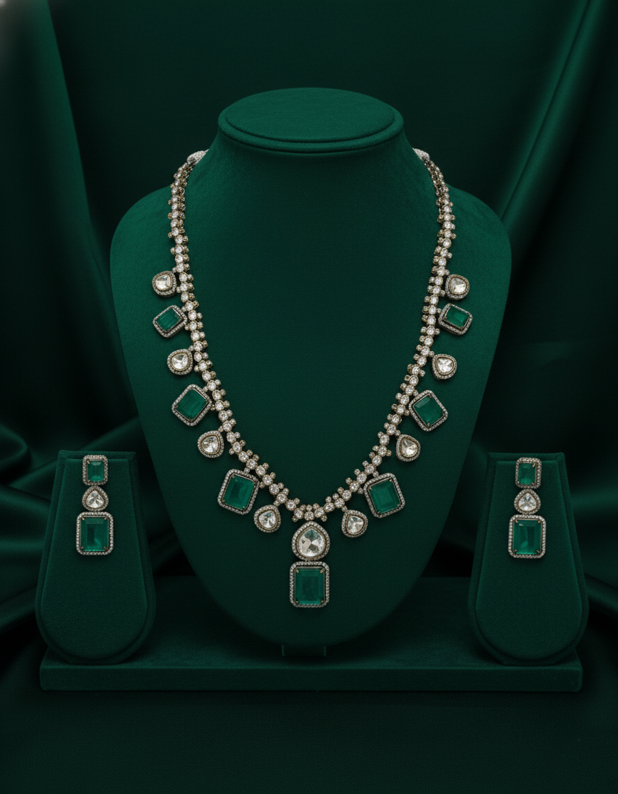 The Necklace: The necklace is meticulously crafted with a series of high-clarity emerald-cut green stones, each framed by a shimmering pavé border of white stones. These are beautifully interspersed with teardrop-shaped Polki motifs, creating a rhythmic and balanced “V-shaped” silhouette that elegantly contours the neck. The focal point is a grand, rectangular emerald-cut pendant that hangs gracefully from a central teardrop stone, adding a sense of length and luxury.