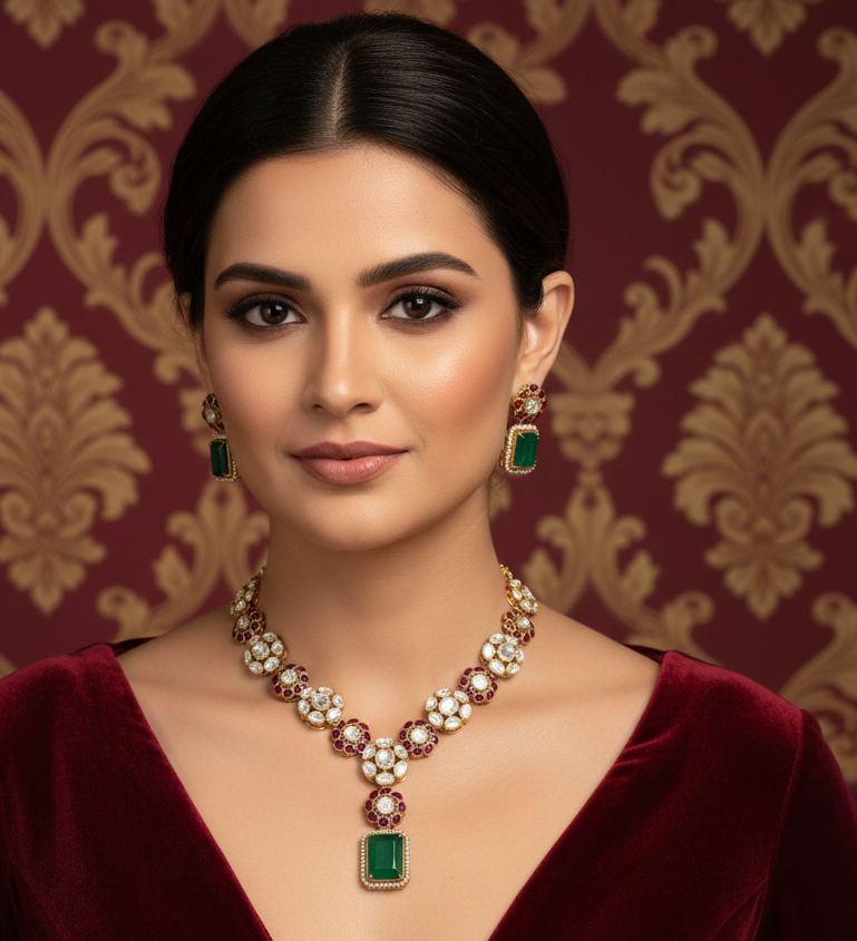 • Style Tip: Wear it against a high-neck black silk dress or a deep-toned saree to let the vibrant green pop.