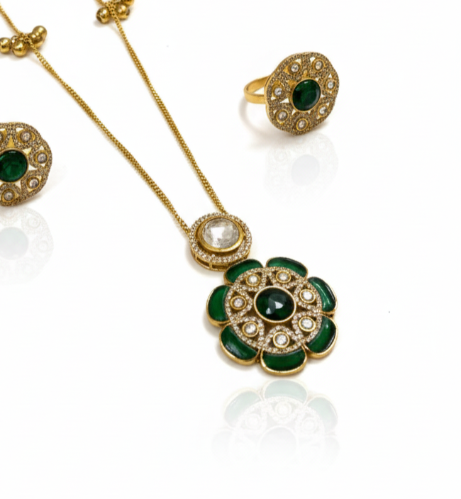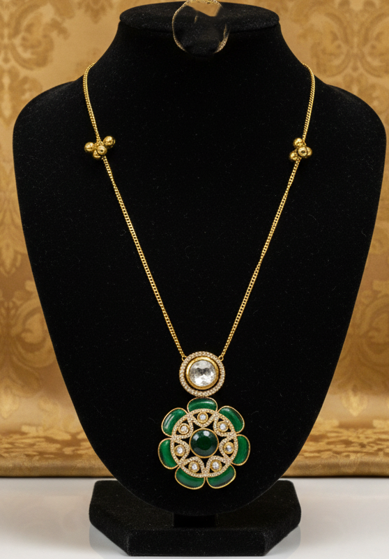 Regal grace in every detail. A majestic floral pendant featuring deep emerald-green stones and shimmering Polki accents, suspended from a delicate gold-toned chain for a timeless, heritage look.