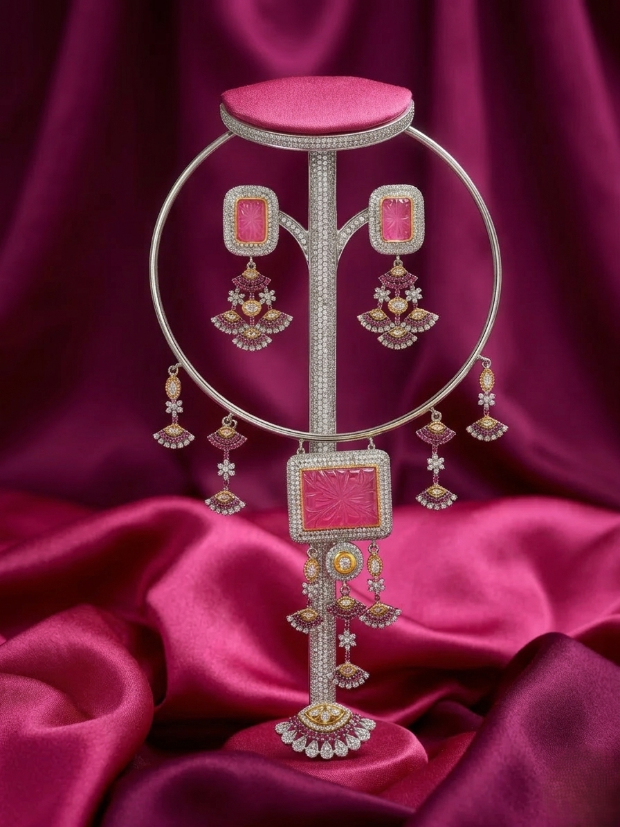Materials: Likely featuring silver-plated alloy, carved synthetic or semi-precious pink quartz, and high-quality cubic zirconia or micro-Polki stones.