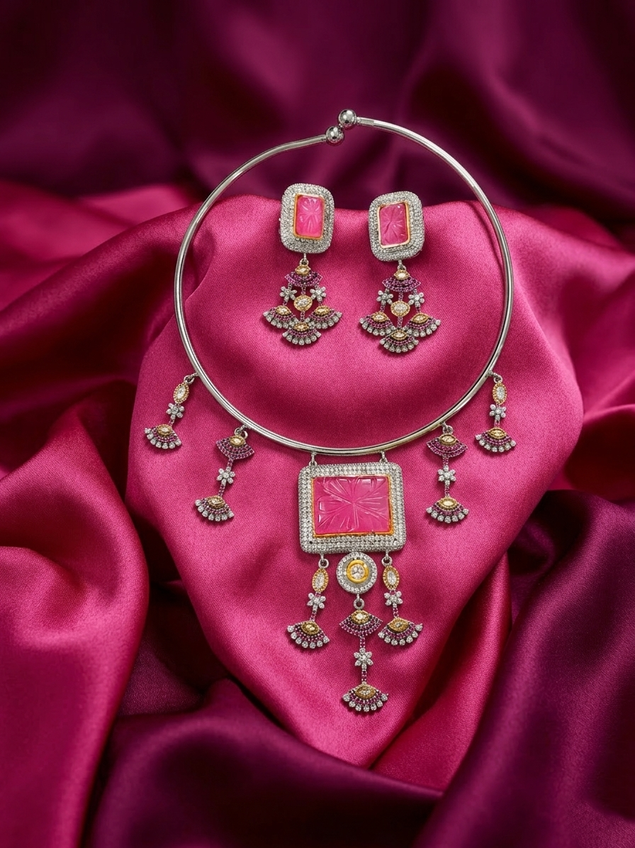 A modern silver-toned jewelry set featuring a rigid collar necklace and carved fuchsia-pink gemstones. Adorned with tiered fan-shaped charms and sparkling micro-accents, this set is a perfect blend of geometric precision and feminine flair.