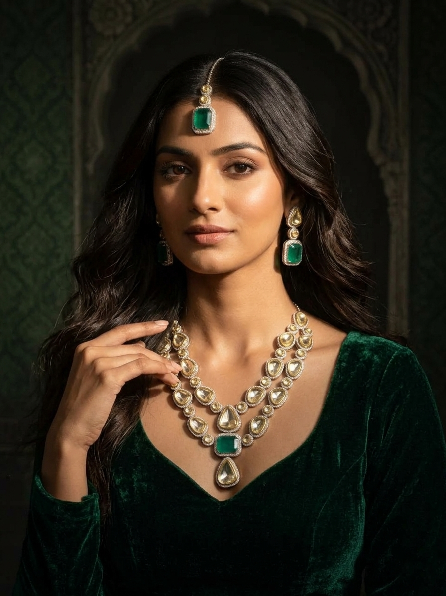 This jewelry set captures the grandeur of old-world royalty with its intricate textures and rich color contrast.