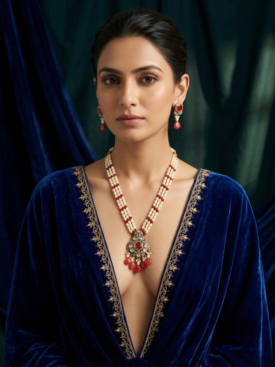 • The Earrings: The set includes a pair of matching drop earrings. Each earring features a geometric red stone stud followed by a cluster of pearls and a singular ruby-red teardrop, mirroring the design language of the main pendant for a cohesive bridal or festive look.