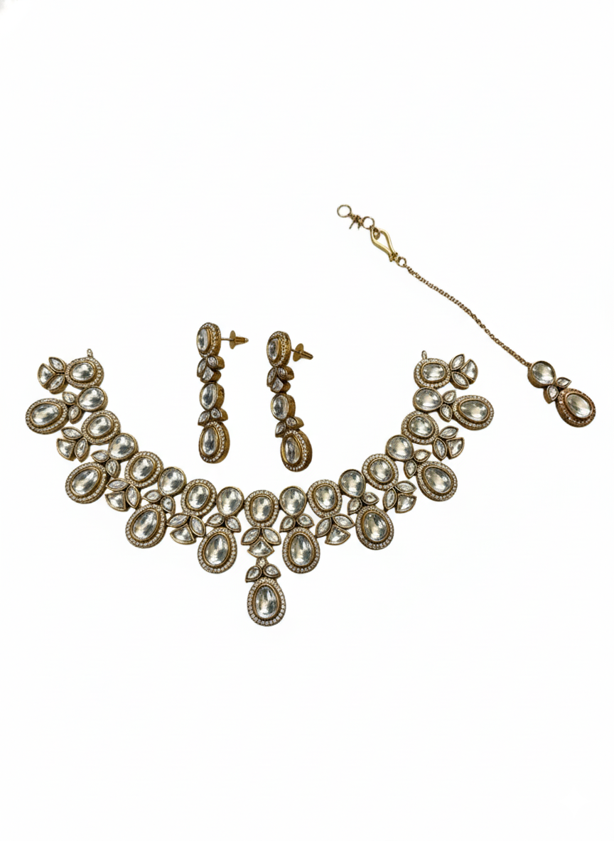 A majestic antique gold-toned jewelry set featuring an intricate vine of pear and oval-cut Polki stones. Complete with cascading drop earrings and a matching Maang Tikka, this set is an exquisite choice for modern brides and high-fashion festive events.