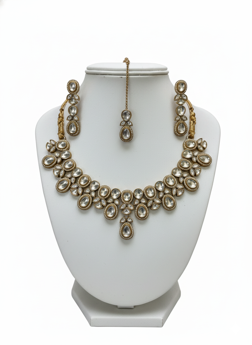 The Maang Tikka: A delicate coordinating headpiece featuring a teardrop-shaped Polki pendant suspended from a fine gold-toned chain, completing the traditional bridal or festive look.